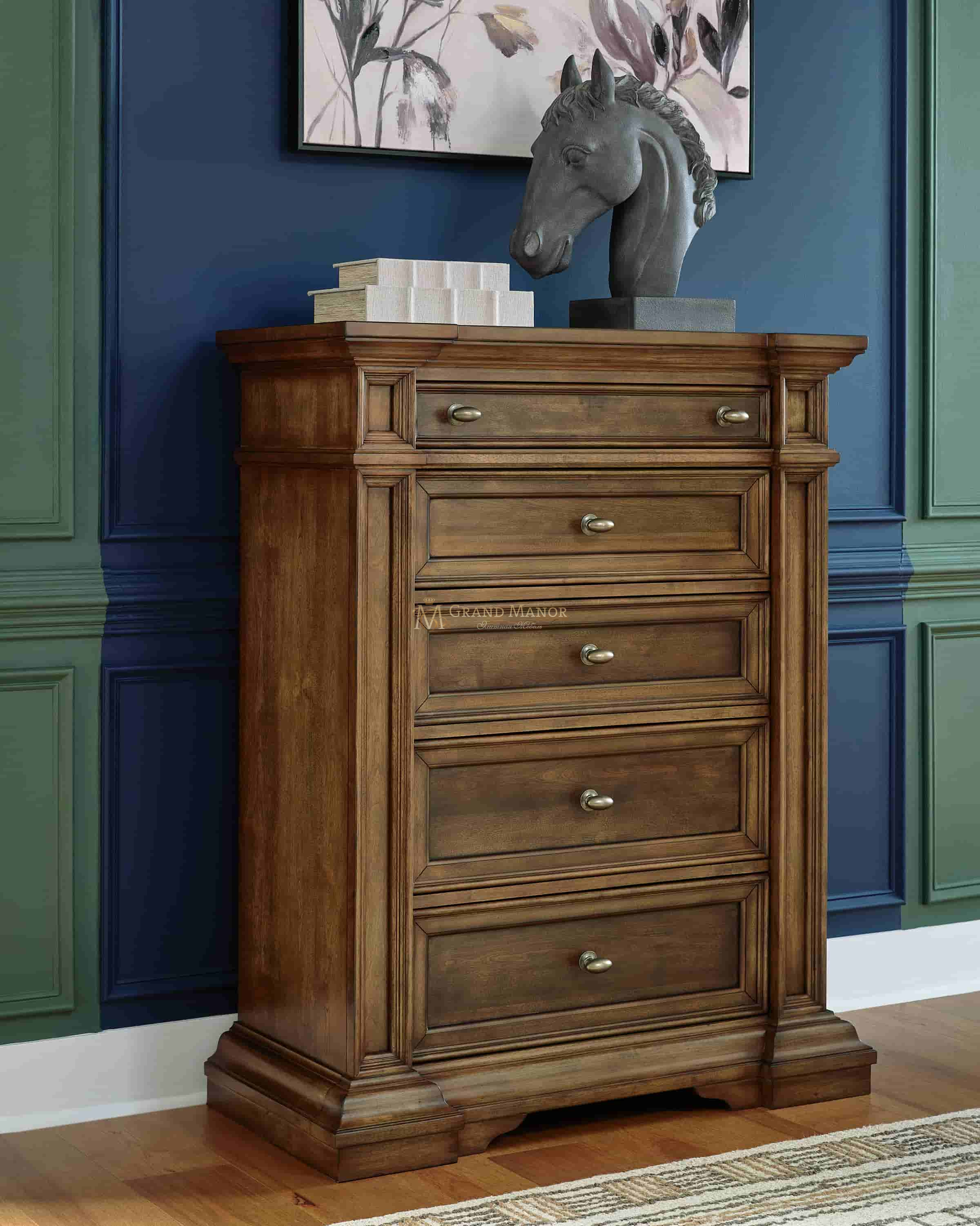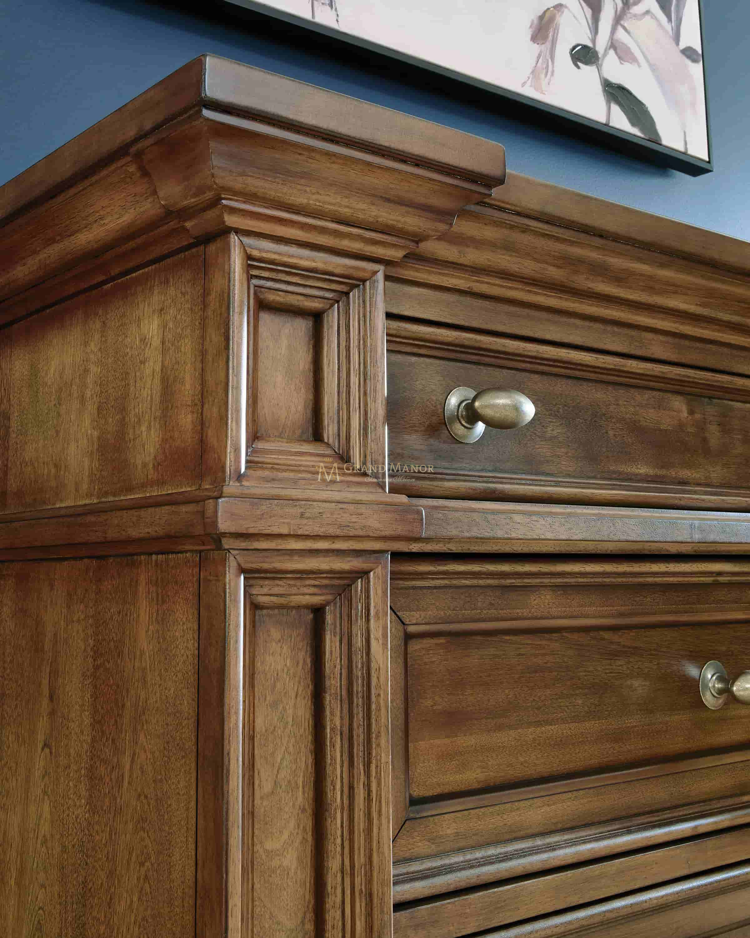 Проверенный временем стиль для современного дома. Этот комод отдает дань уважения традиционной эстетике: его богато украшенная отделка придает ему величественную элегантность. Крупные лепные детали и ручки цвета состаренной латуни изящно дополняют изделие.