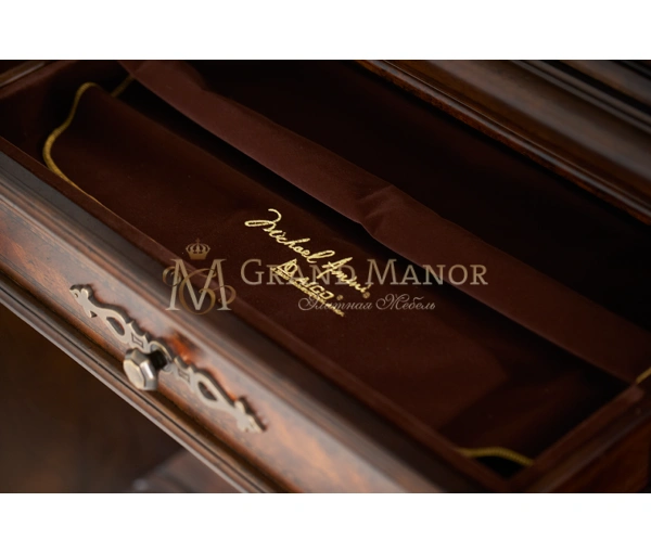 Искусно вырезанное дерево с изящными украшениями | Кованые ручки на выдвижных ящиках и дверцах.