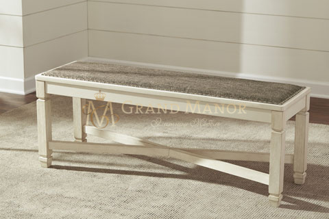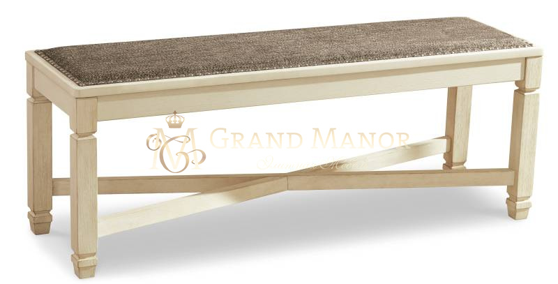 Эта просторная скамья, предлагающая комфорт и стиль, соблазняет мягким сиденьем, обтянутым тяжелой тканью, которая дополняет состаренную белую отделку.