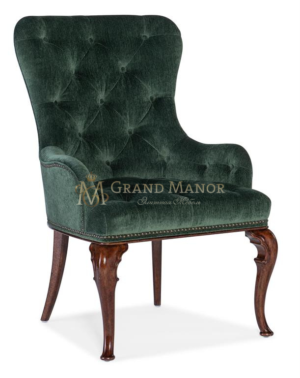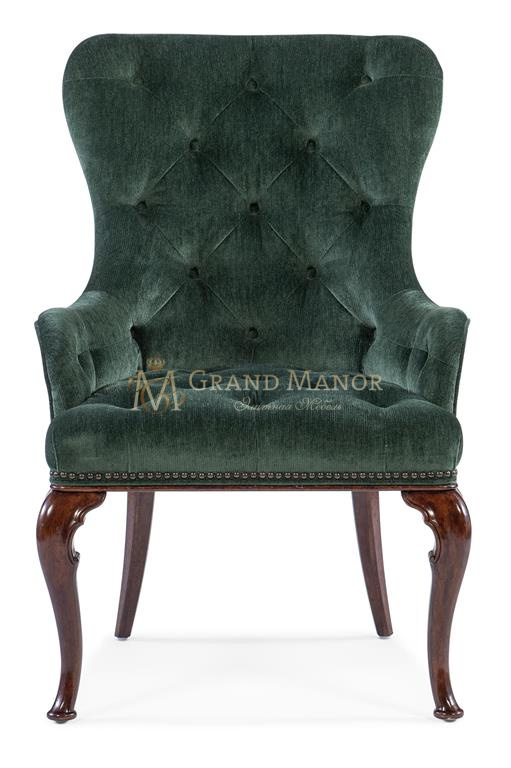 Декорировано бронзовыми гвоздиками по низу сиденья, а также по внешней стороне подлокотников и спинки.