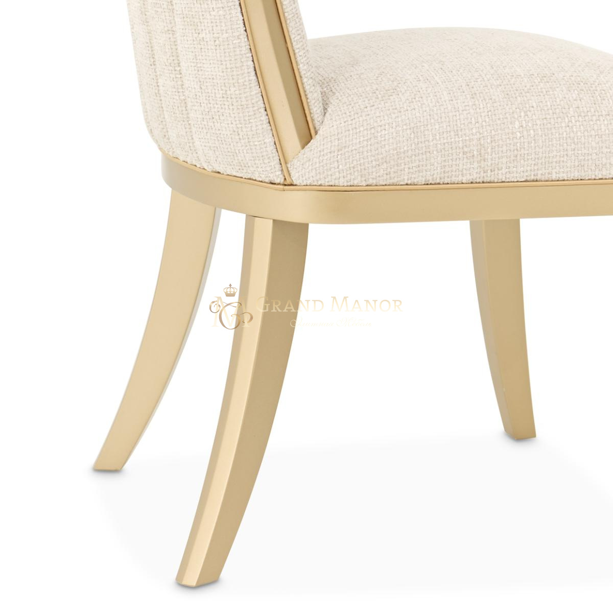 Обивка из мягкого шенилла нежного оттенка добавляет тактильной теплоты и ярких акцентов. Золотые вставки по бокам каркаса создают изысканный контраст, а аккуратно выполненные швы подчеркивают утонченность дизайна.