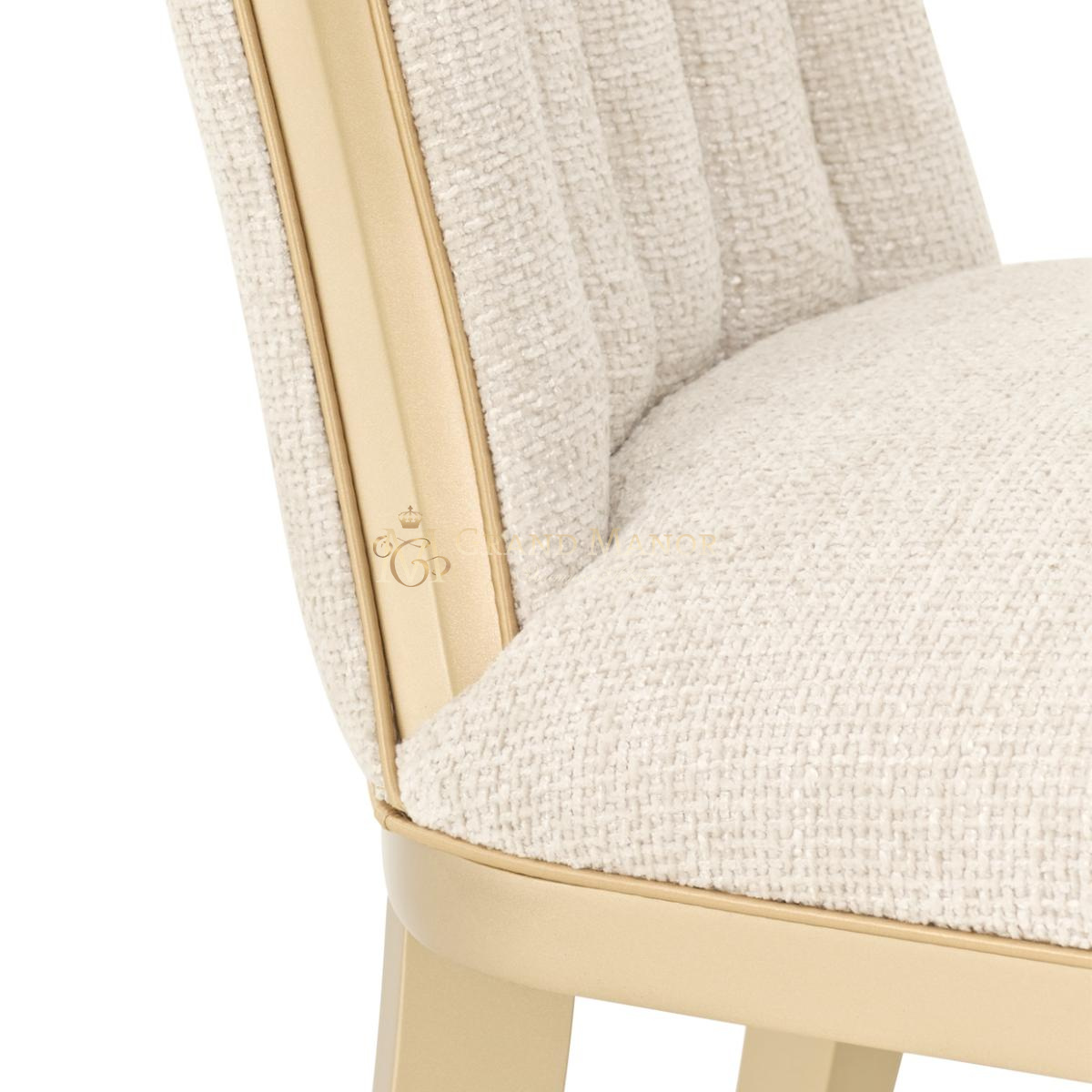 Ножки стула, выполненные из каучукового дерева и покрытые золотом, придают ему особый шарм. Это обеденное кресло — результат внимательного подхода к каждой детали, сочетающего традиционные мотивы с современным дизайном.