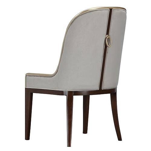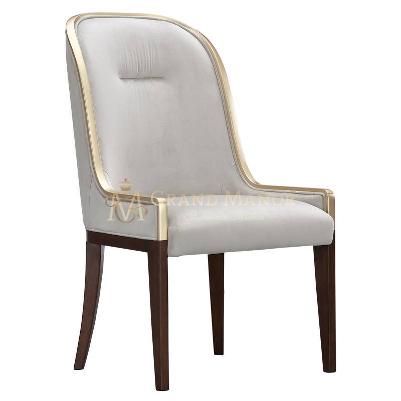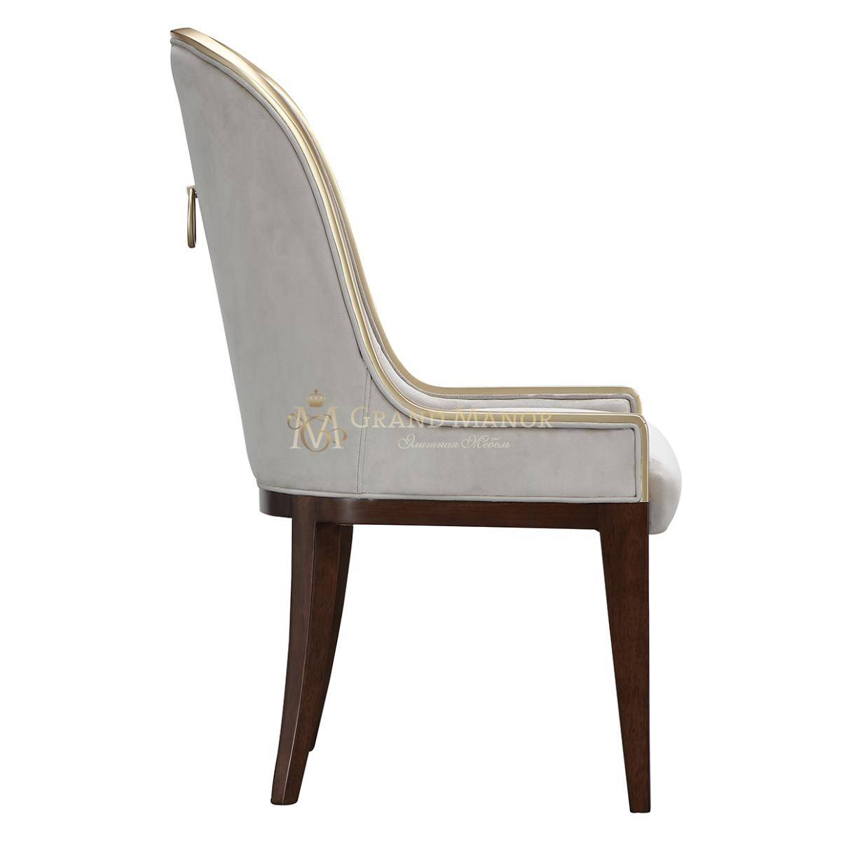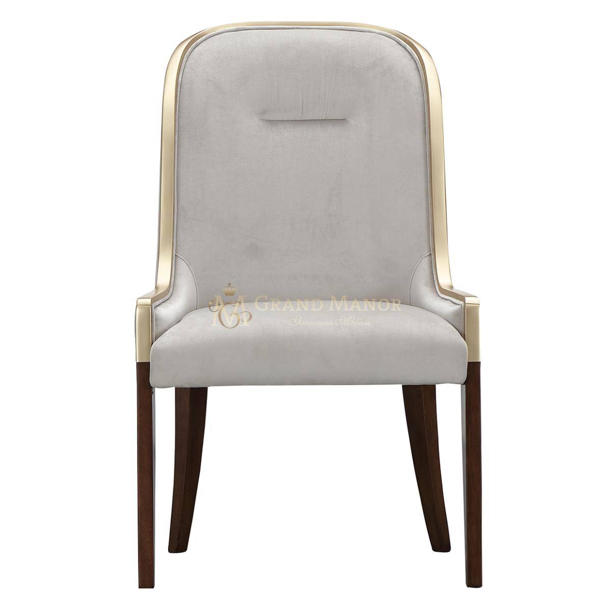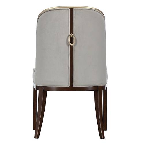 Остроконечные ножки, выполненные из орехового дерева, создают резкий контраст с мягким бархатом. А деревянная вставка и декоративное золотое кольцо на задней спинке добавляют предмету нотку сдержанного гламура.
