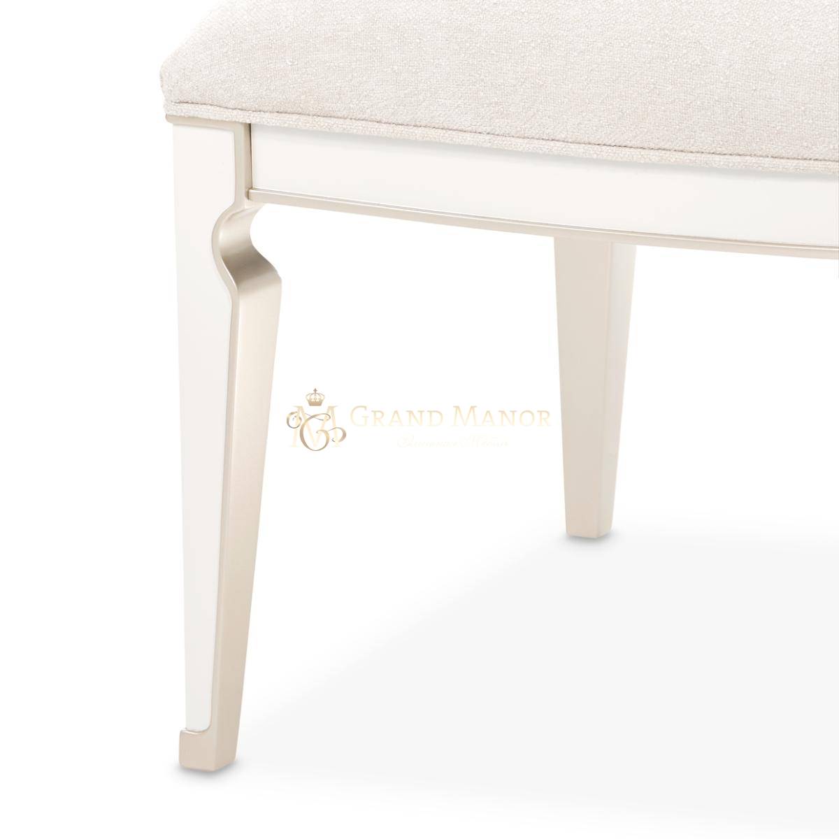 Его утонченный силуэт подчеркивает каркас, отделанный жемчугом и вставками цвета шампанского, а изящная прорезная деталь придает ему еще более изящные очертания. Этот стул, созданный для красоты и удобства, станет идеальным дополнением к любому изысканному обеденному пространству.