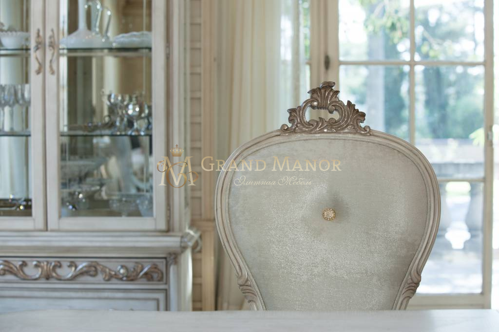 Для изготовления каркаса стульев используется массив березы. Этот материал не только наполняет пространство изысканным шармом, но и является подтверждением респектабельности владельца дома. Для обивки сидения и спинки стула был выбран металлизированный вельвет. Этот материал, кроме красивого внешнего вида, обладает долговечностью, такой стул прослужит очень долго, наполняя пространство столовой позитивной природной энергетикой.
