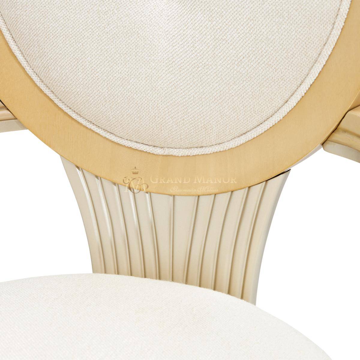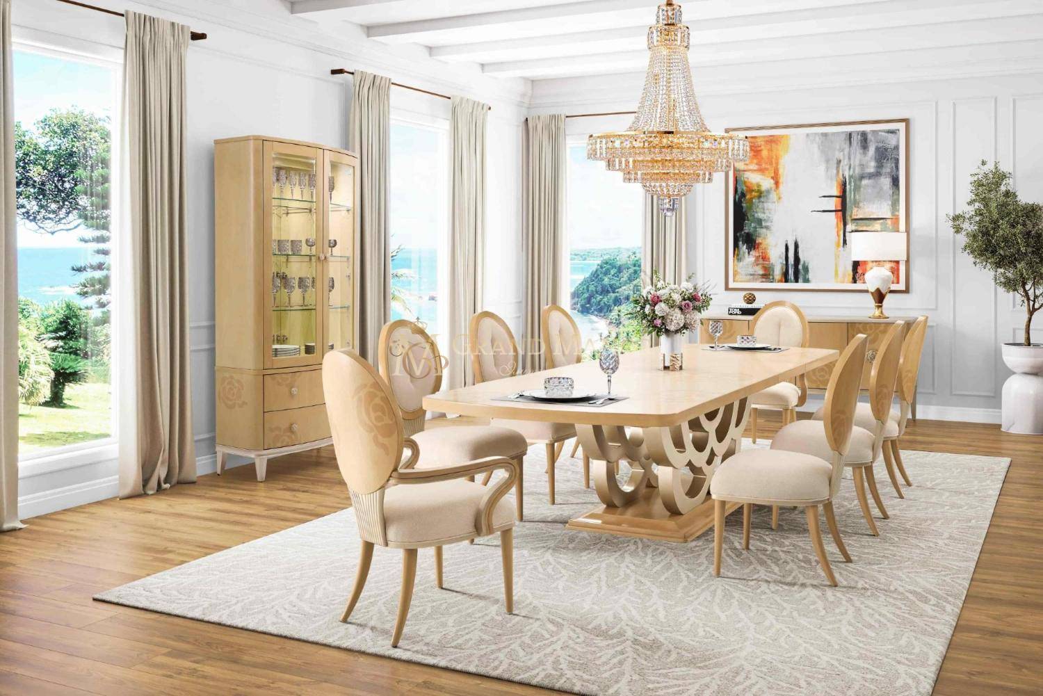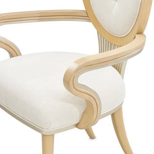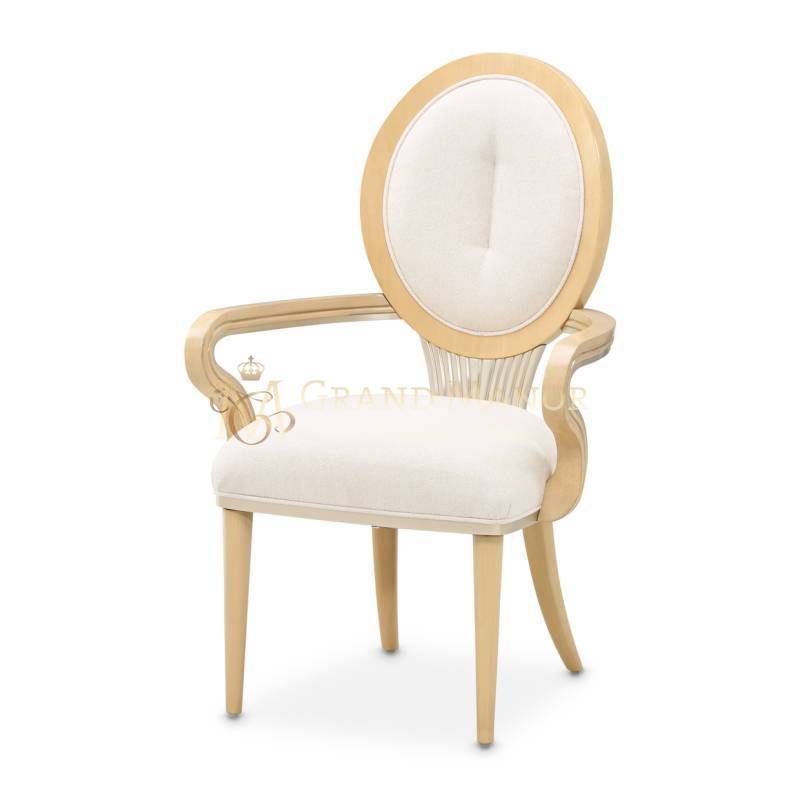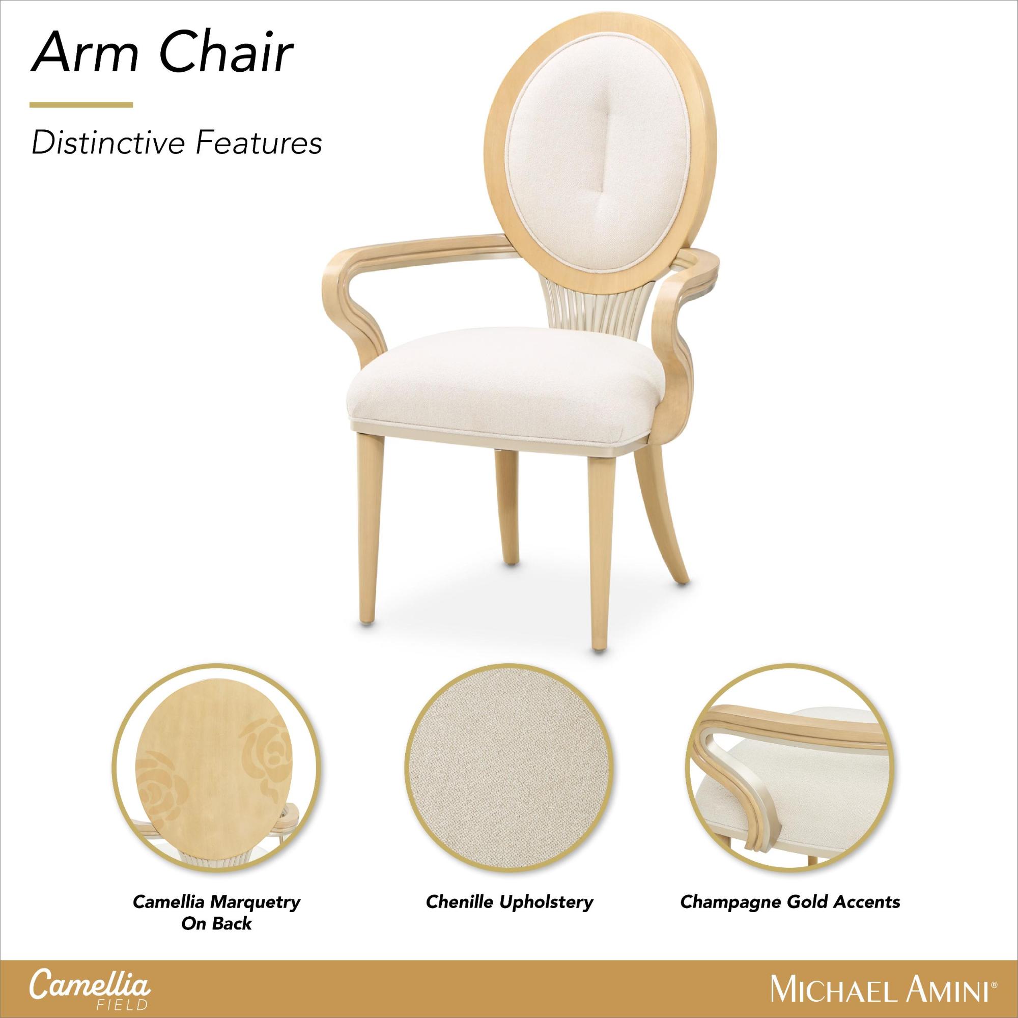 Обеденное кресло Camellia Field с его изящным силуэтом и тщательно продуманными деталями представляет собой воплощение изысканного комфорта. Овальная спинка, украшенная маркетри цвета камелии, гармонично сочетается с теплой карамельной отделкой и вставками цвета шампанского. Обитое мягким шениллом, это кресло сочетает в себе роскошь материалов и поддерживающий дизайн, создавая уютную атмосферу для ваших трапез.