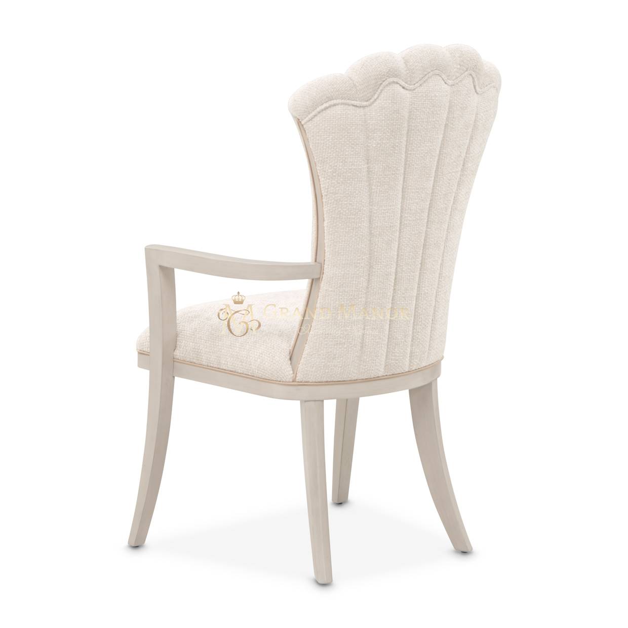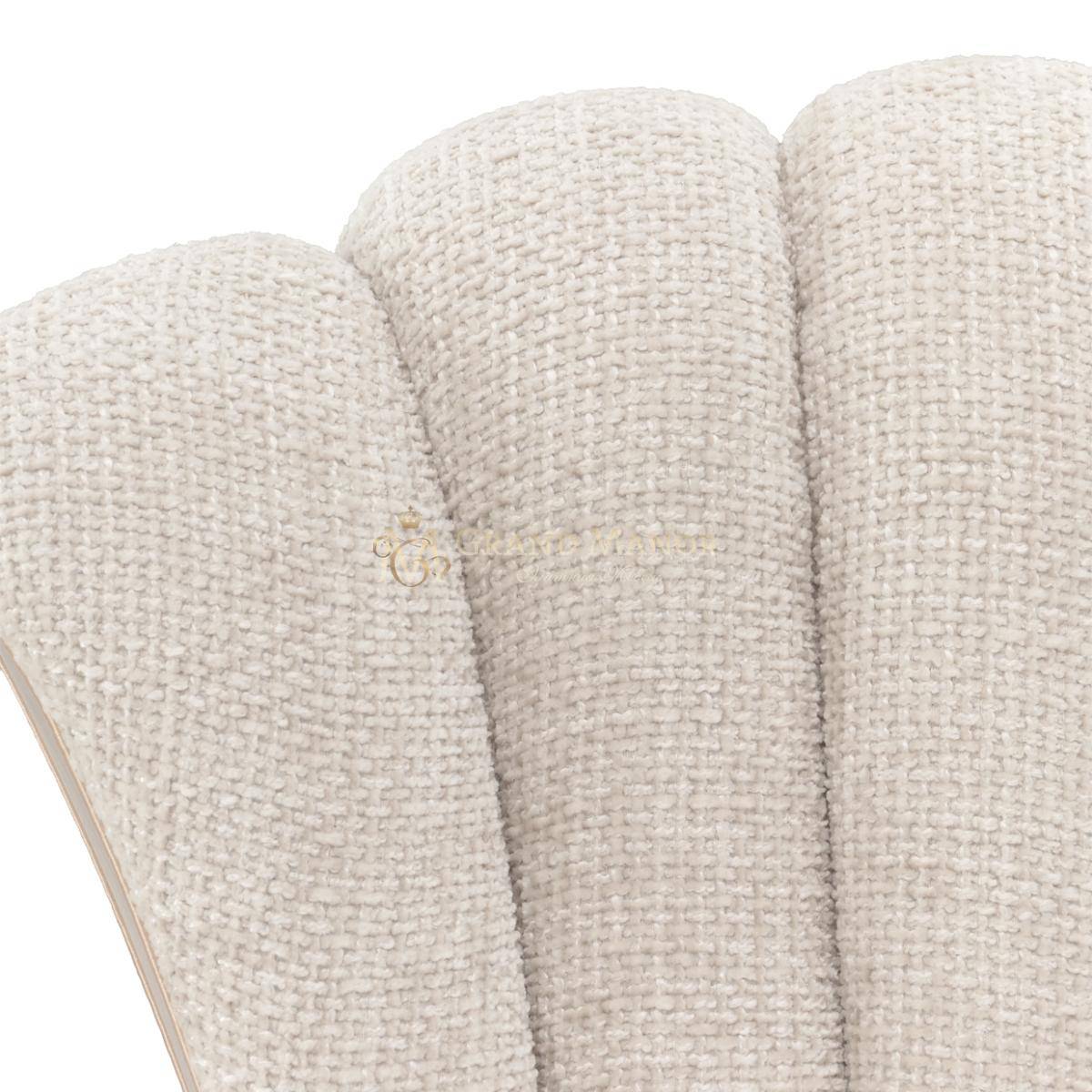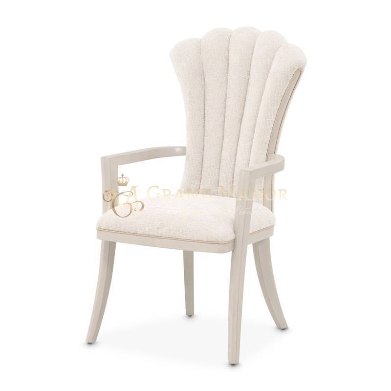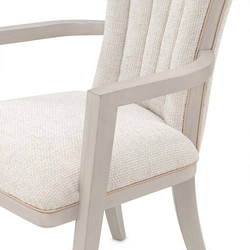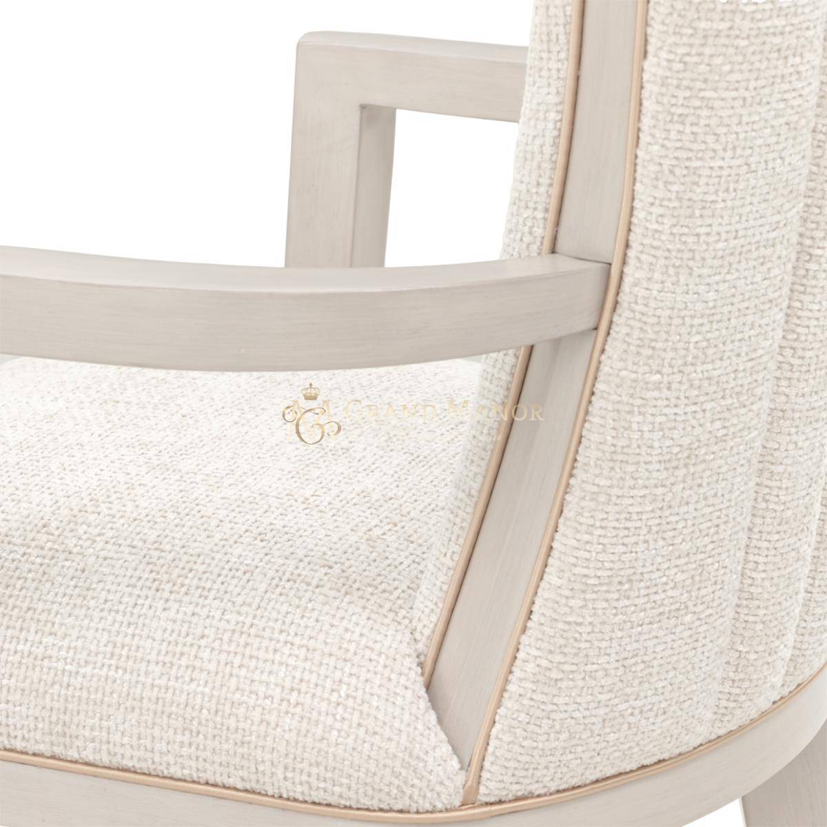 Обеденное кресло Fantosini с его скульптурными изгибами и блестящими деталями добавляет особый шарм любому обеду. Его изящный силуэт с расклешенной спинкой из насыщенного шенилла цвета капучино сочетает теплые серые и натуральные оттенки, создавая ощущение мягкости. Плавные подлокотники и заостренные ножки из массива каучукового дерева украшены серебристым напылением. Вставки из дерева и мерцающая золотая окантовка придают креслу утонченный контраст, излучающий роскошь.