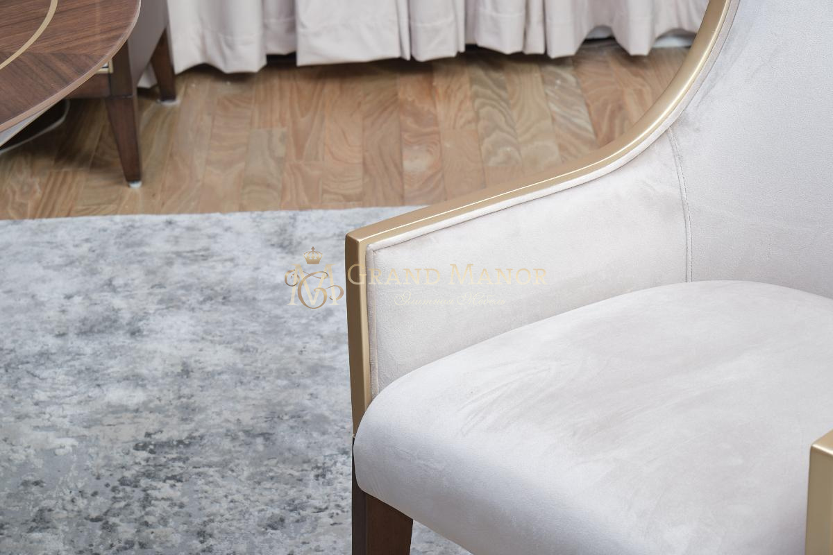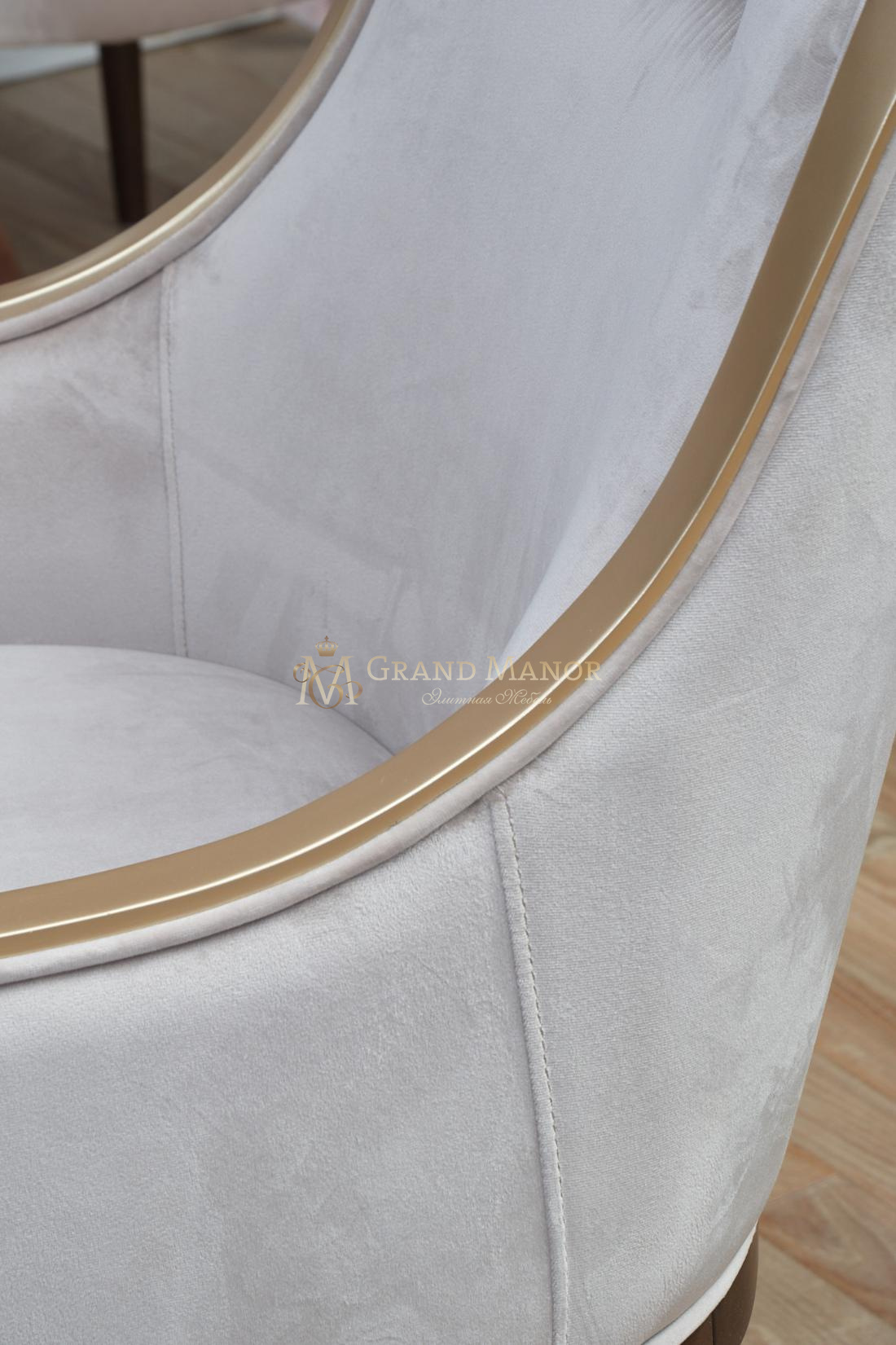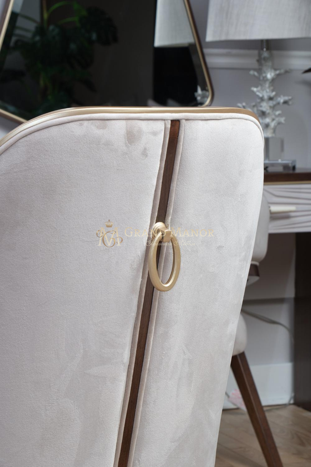 Остроконечные ножки, выполненные из орехового дерева, создают резкий контраст с мягким бархатом. А деревянная вставка и декоративное золотое кольцо на задней спинке добавляют предмету нотку сдержанного гламура.