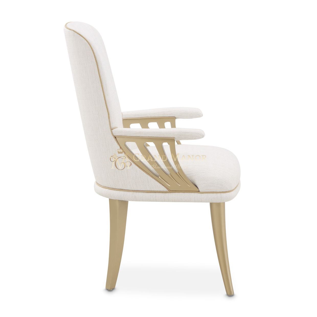 Обеденное кресло La Terrazza воплощает элегантность и скульптурную утонченность. Оно добавляет столовой изысканный комфорт и артистизм. Ткань с мягким металлическим блеском и светящаяся текстурированная поверхность делают его привлекательным и утонченным. Золотистая отделка подчеркивает силуэт, а слегка расклешенные подлокотники с ажурными вставками придают креслу объем и подвижность. Заостренные золотые ножки завершают образ, придавая креслу изящество с любой стороны.