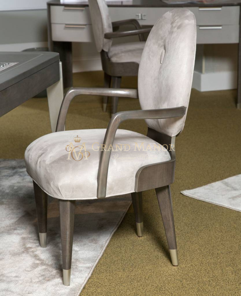Сиденье и спинка обиты бледно-серым бархатом.