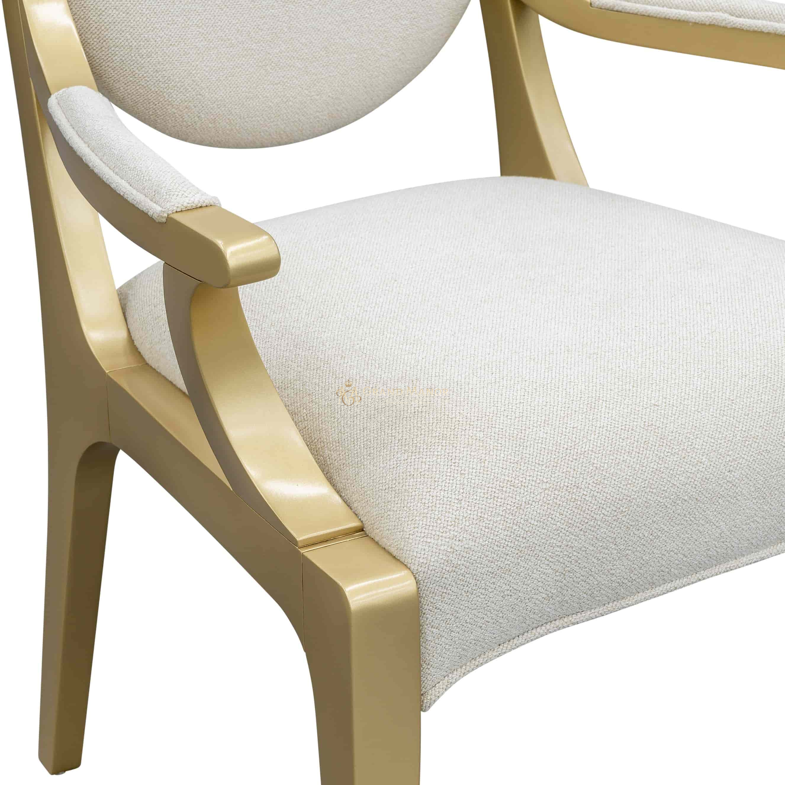 Каркас выполнен в сияющем золоте, элегантно дополненном мягкой обивкой из шенилла мягкого, неброского оттенка шелка. Мягко изогнутые подлокотники с мягкими накладками обеспечивают комфорт и изысканность, а заостренные ножки из цельного каучукового дерева обеспечивают надежную поддержку. Спинка украшена золотистым металлом и перламутром, что добавляет яркости отделке, которая украсит любую обеденную обстановку.