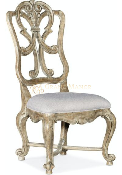 Резная фантазийная спинка, изогнутые ножки. Тканевое сиденье.