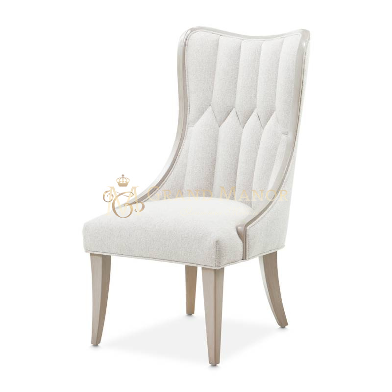 Высокая спинка этого кресла элегантно украшена швеллерной строчкой, что создает одновременно классический и современный образ.