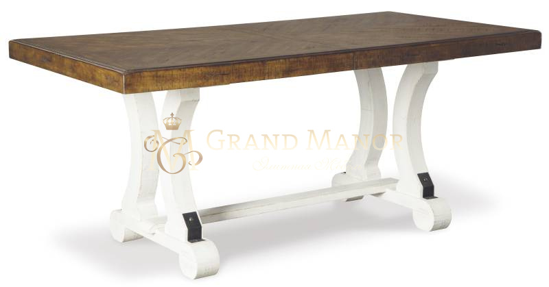 Двухцветная состаренная отделка стола привлекает внимание: коричневая столешница и винтажное белое основание создают неповторимый шарм. А особо толстый край стола с инкрустацией в виде книги добавляет ему уникальности.