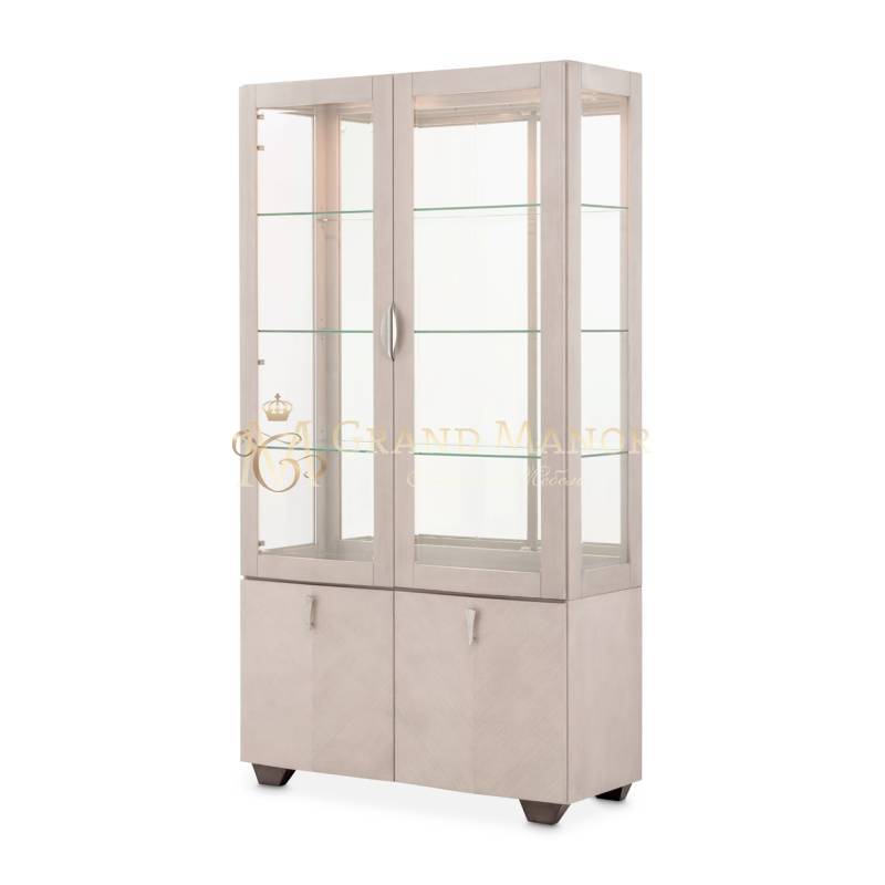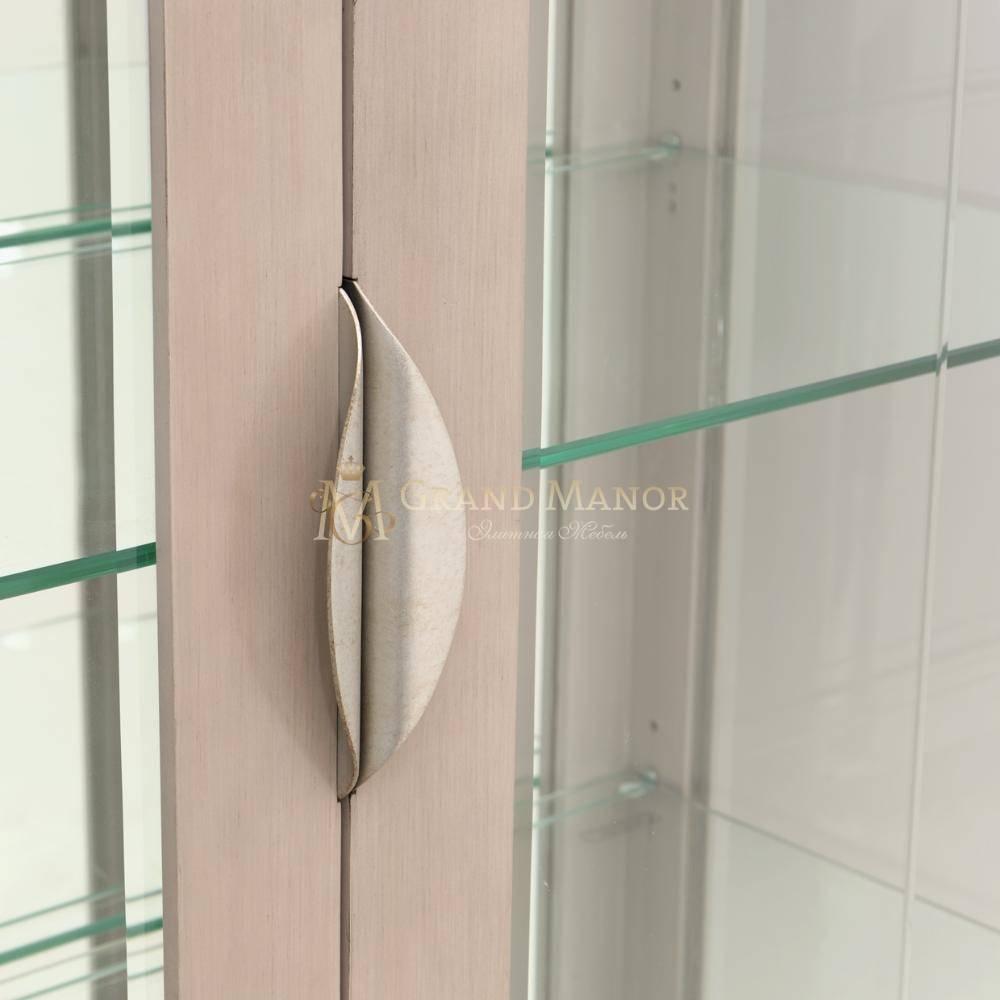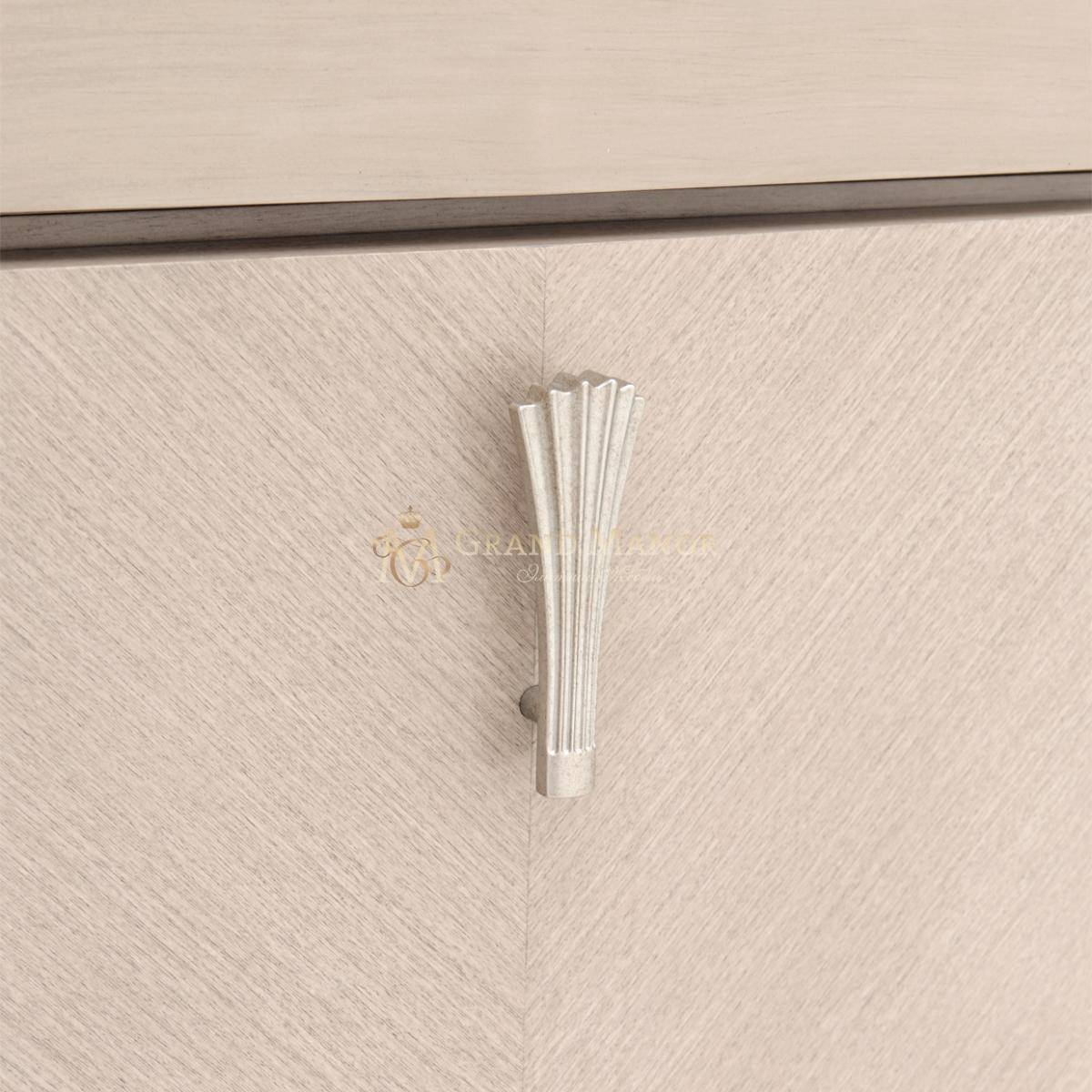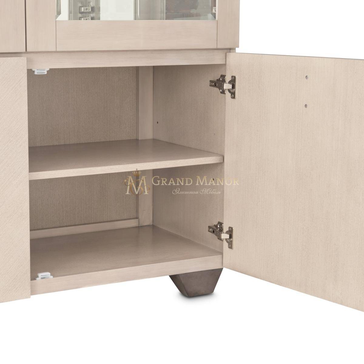 Сервант-витрина Fantosini — это воплощение утонченной элегантности, способное создать изысканную атмосферу в вашем доме. Его величественный силуэт из дубового шпона отделан светящимся серебристо-дымчатым тоном, который излучает тихую роскошь. Верхняя часть витрины обрамлена прозрачными дверцами со скошенными краями. Внутри — зеркальная задняя панель и стеклянные полки, которые отражают и усиливают свет, превращая витрину в сияющее хранилище ваших ценных коллекций. Мягкое светодиодное освещение создает теплый, уютный свет, делая каждый предмет центральным акцентом. Основание шкафа оснащено двумя плавно закрывающимися дверцами, за которыми скрывается дополнительное пространство для хранения белья, сервировочной посуды и предметов первой необходимости. Скульптурная фурнитура в стиле ар-деко делает этот предмет не только функциональным, но и визуально привлекательным.