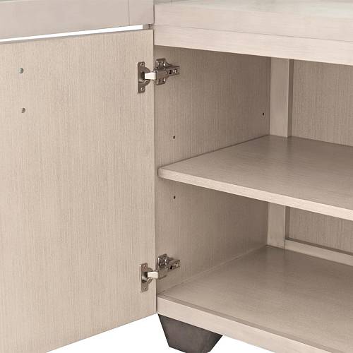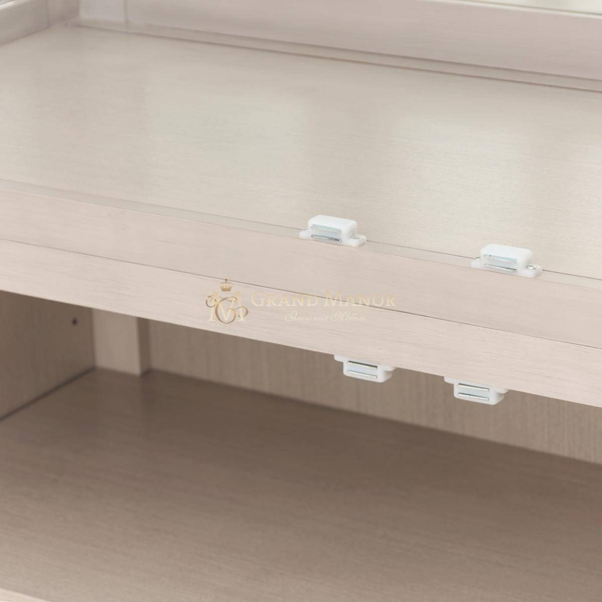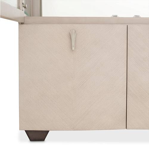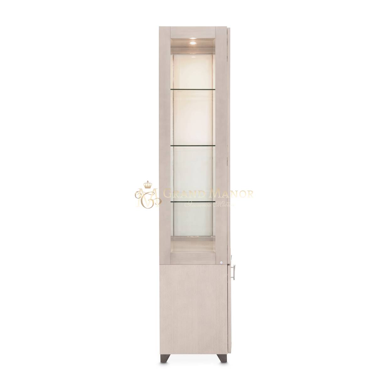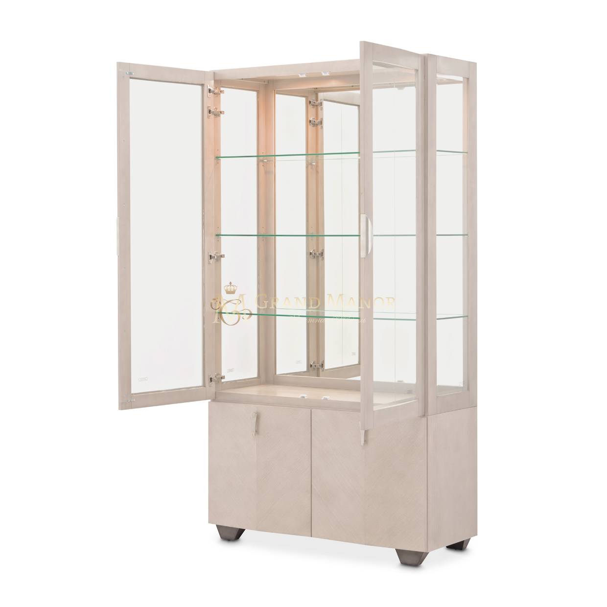 Сервант-витрина Fantosini — это воплощение утонченной элегантности, способное создать изысканную атмосферу в вашем доме. Его величественный силуэт из дубового шпона отделан светящимся серебристо-дымчатым тоном, который излучает тихую роскошь. Верхняя часть витрины обрамлена прозрачными дверцами со скошенными краями. Внутри — зеркальная задняя панель и стеклянные полки, которые отражают и усиливают свет, превращая витрину в сияющее хранилище ваших ценных коллекций. Мягкое светодиодное освещение создает теплый, уютный свет, делая каждый предмет центральным акцентом. Основание шкафа оснащено двумя плавно закрывающимися дверцами, за которыми скрывается дополнительное пространство для хранения белья, сервировочной посуды и предметов первой необходимости. Скульптурная фурнитура в стиле ар-деко делает этот предмет не только функциональным, но и визуально привлекательным.