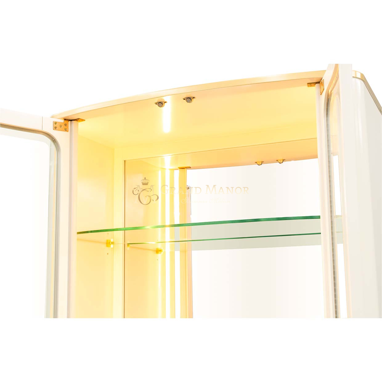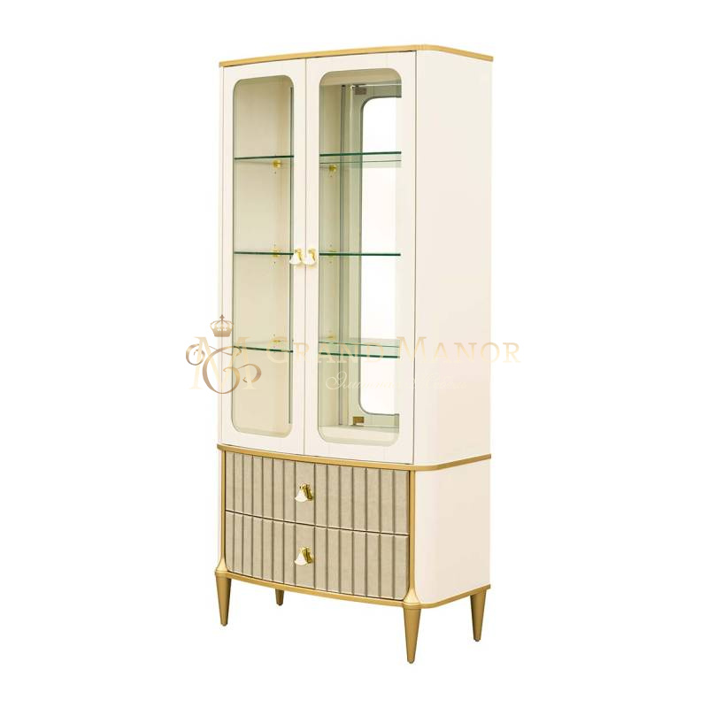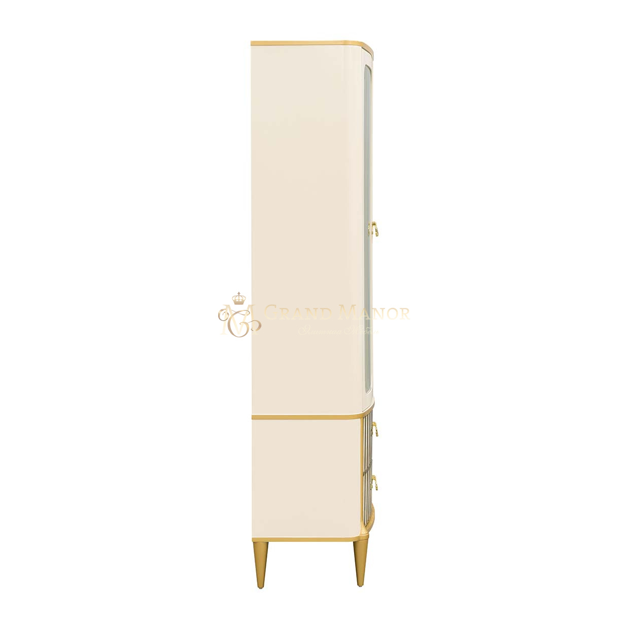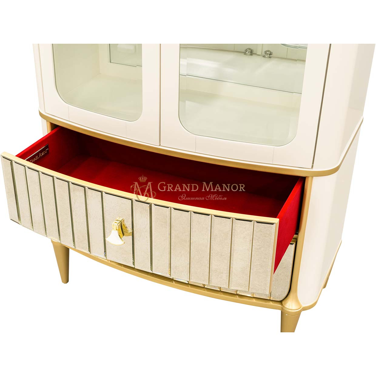 Антикварные зеркальные фасады выдвижных ящиков внизу добавляют витрине стиль, а их внутренняя отделка из насыщенного красного бархата обеспечивает стильное и роскошное хранение. Скульптурные элементы из золота и перламутра завершают этот изысканный дизайн, придавая ему особое очарование.