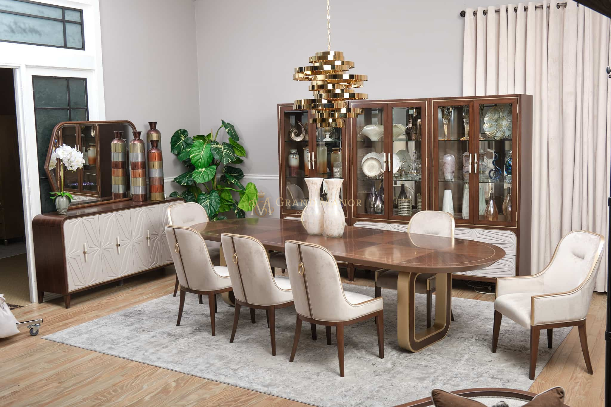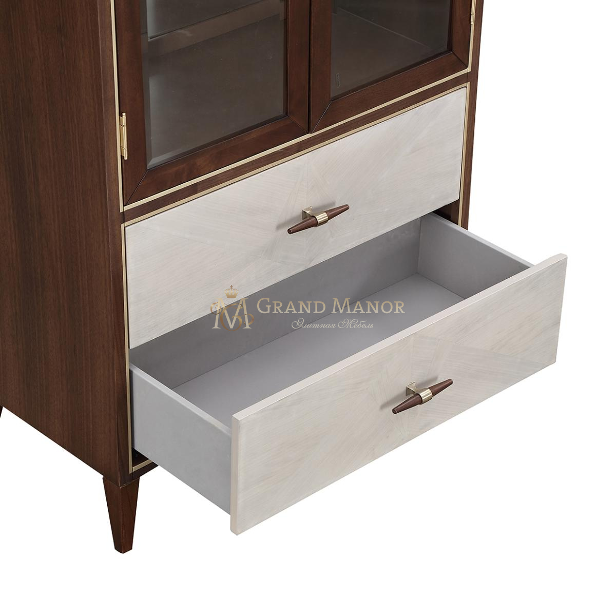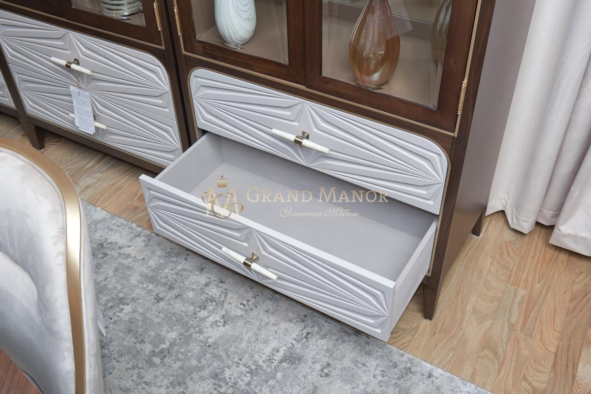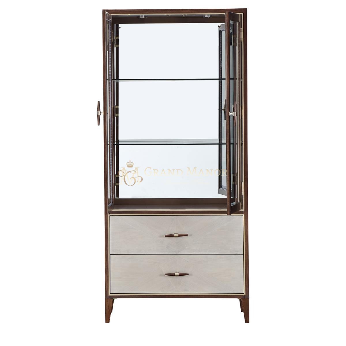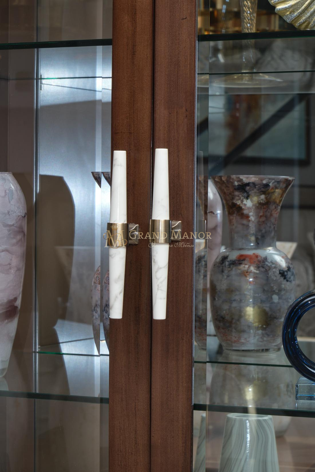 Дизайн витрины дополнен золотой отделкой, а изящные ручки из дерева и металла придают ей утонченный и изысканный вид.