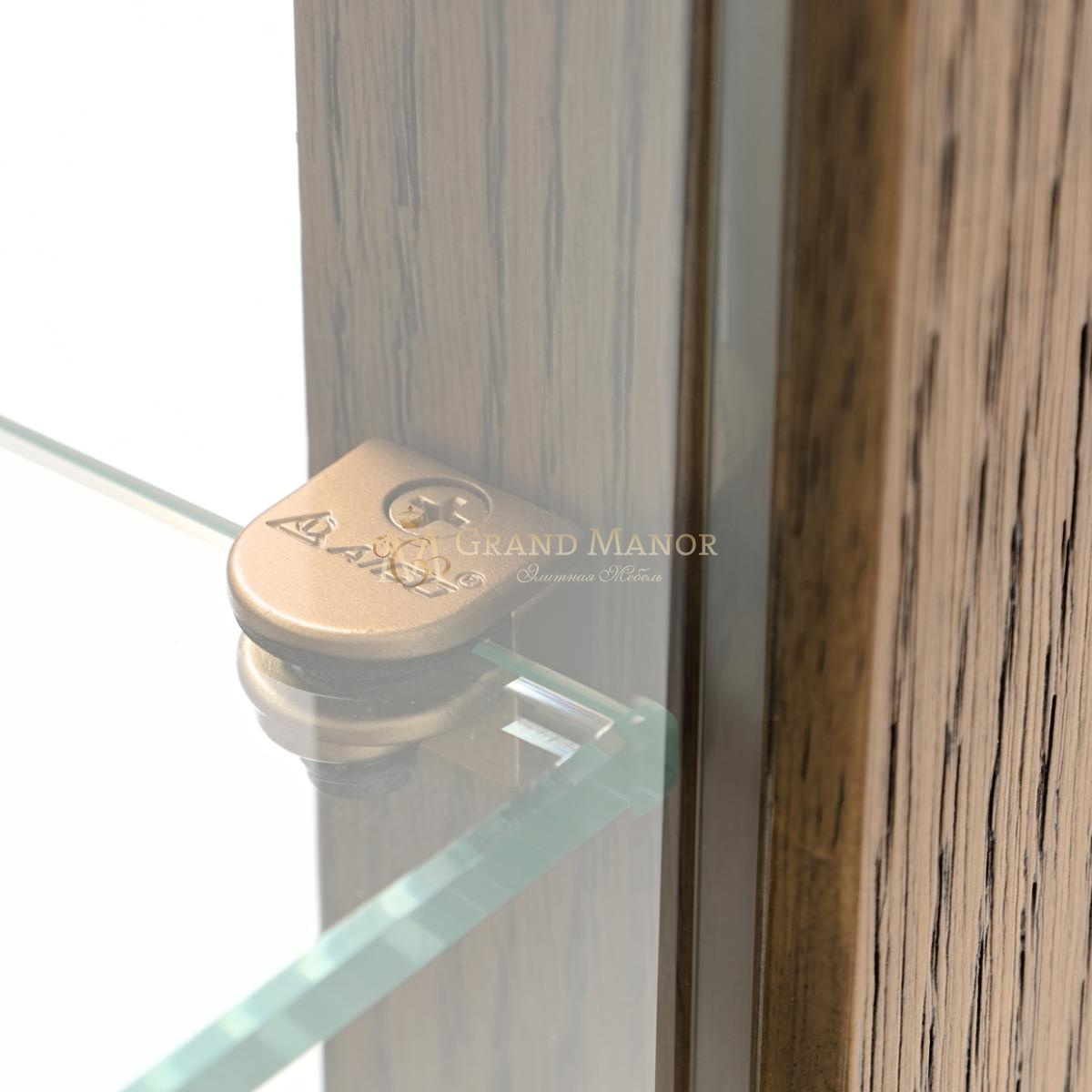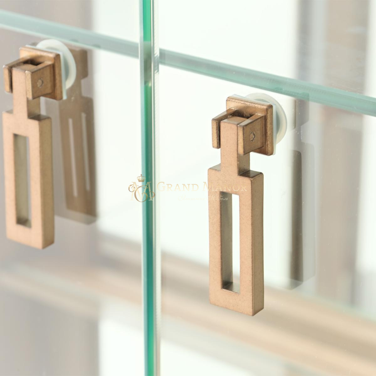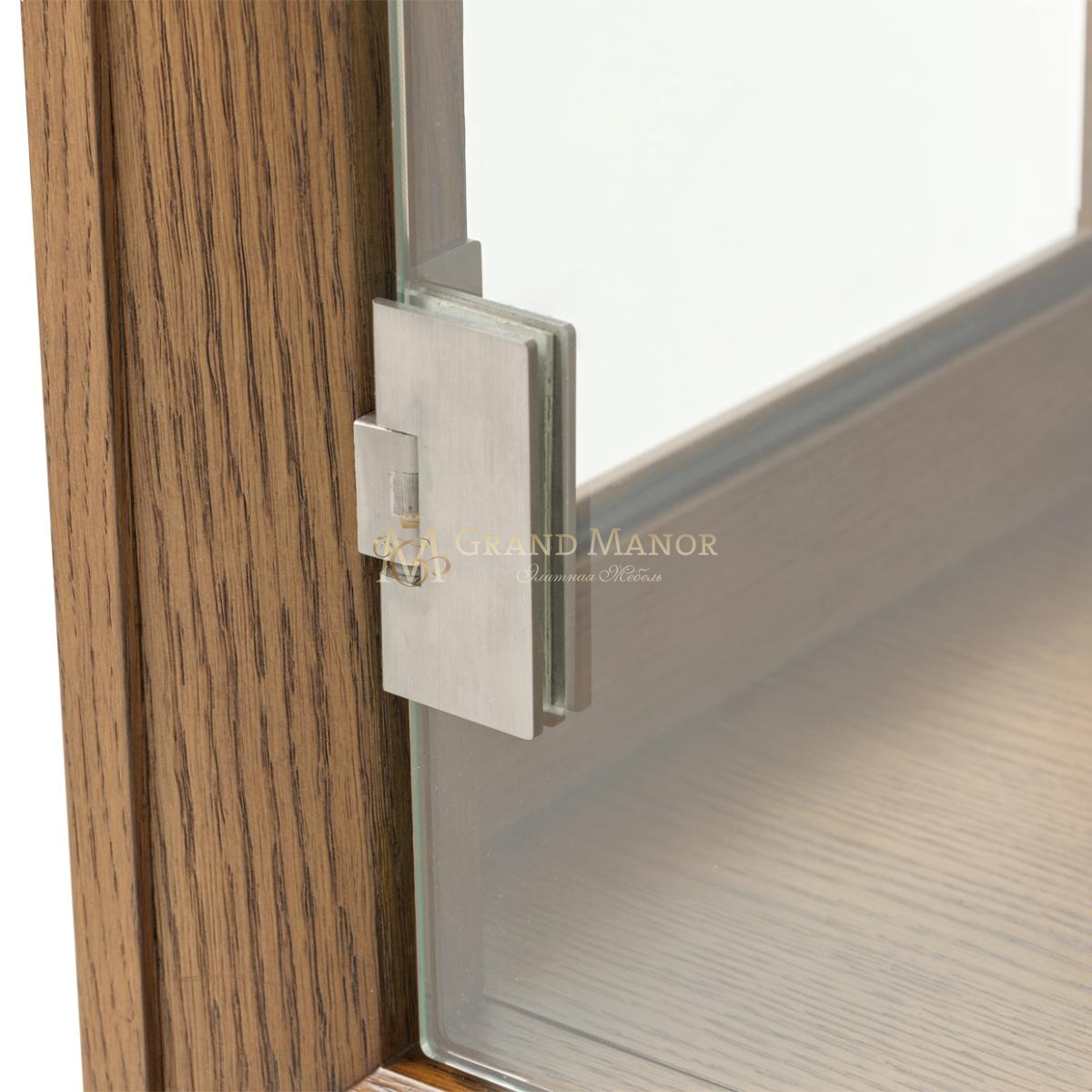 Изящные стеклянные дверцы открываются, открывая вид на сверкающие стеклянные полки, а зеркальная задняя панель отражает свет и форму, создавая глубину и драматизм.
