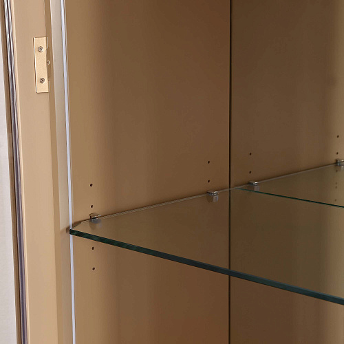 Две дверцы из тонированного стекла открывают вид на три вместительных стеллажа с двумя регулируемыми стеклянными полками, позволяющими индивидуально планировать пространство.