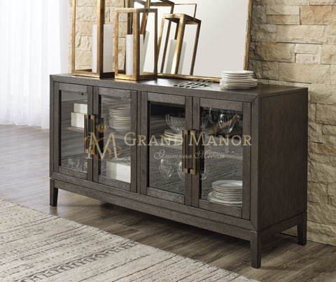 Индивидуальные ручки на двустворчатых шкафах подчеркивают четкие современные линии сервера, а их отделка цвета латуни и металлические акценты того же цвета завершают высококлассную эстетику.