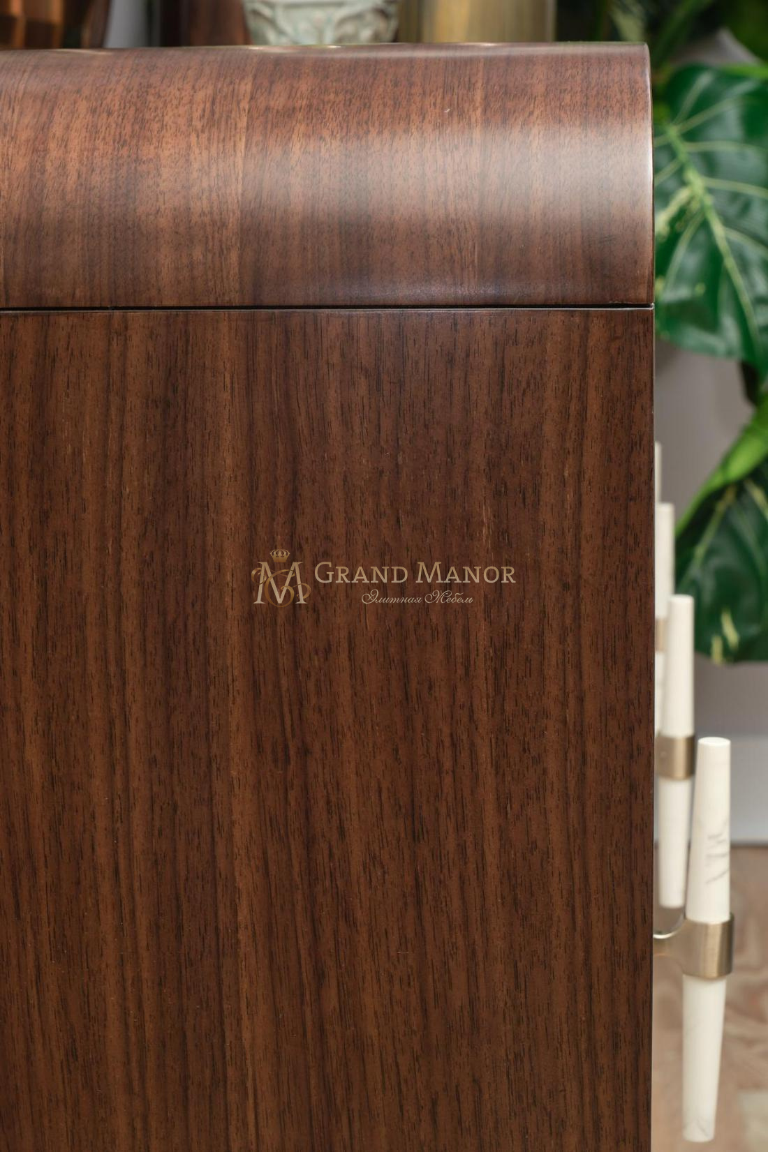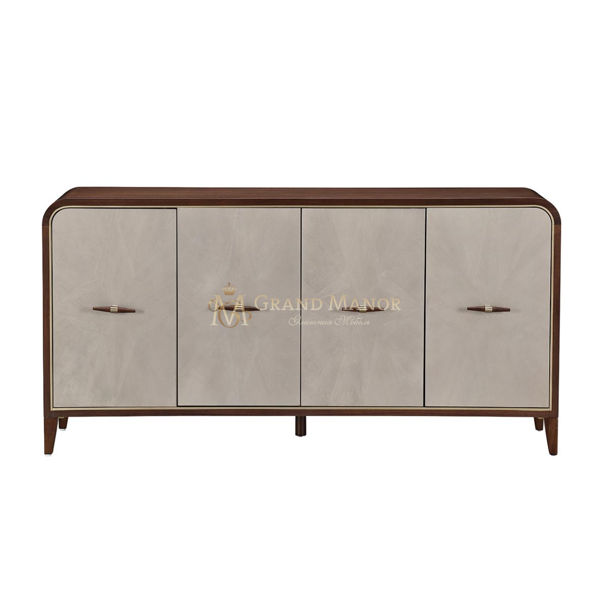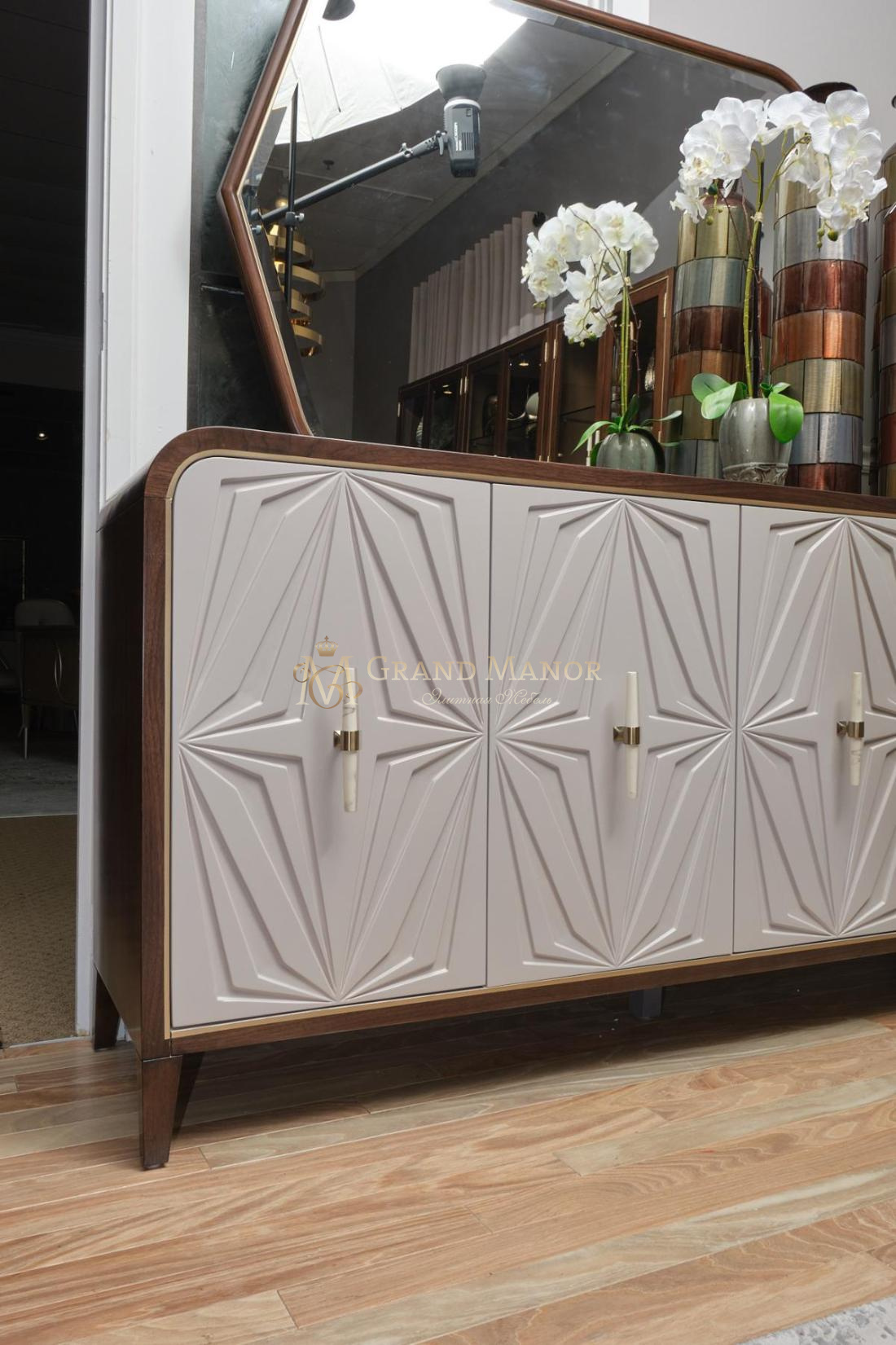 Комод для посуды Houston — это сочетание современной элегантности и функциональности, идеально подходящее для хранения различных вещей. Он выполнен из орехового дерева с богатой отделкой и контрастными серыми дверцами, украшенными нежным узором в виде звездочек на тонко текстурированной поверхности. Изысканная золотая отделка подчеркивает утонченный силуэт изделия.