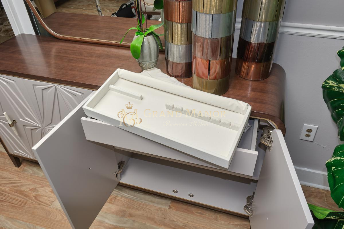 Два выдвижных ящика обеспечивают дополнительное место для хранения, а один из них содержит роскошный бархатный органайзер для столового серебра или элегантных аксессуаров.