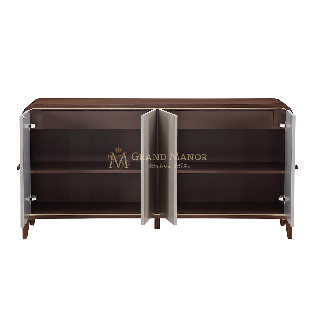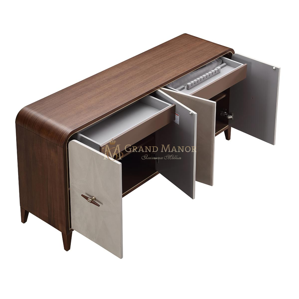 Изящные заостренные ручки, сочетающие дерево и металл, придают комоду современный вид. Благодаря большому объему места для хранения и тщательно продуманным деталям, этот буфет станет не только функциональным, но и стильным элементом любого обеденного или жилого пространства.