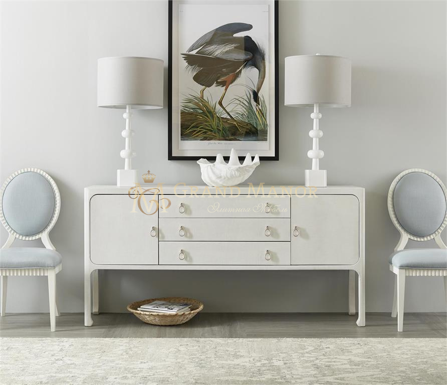 Выполненный из дерева и рафии, он предлагается в отделке из белой лакированной ткани Sand Dollar с декоративными ручками цвета шампанского и фигурными ножками, придающими ему дизайнерский вид.