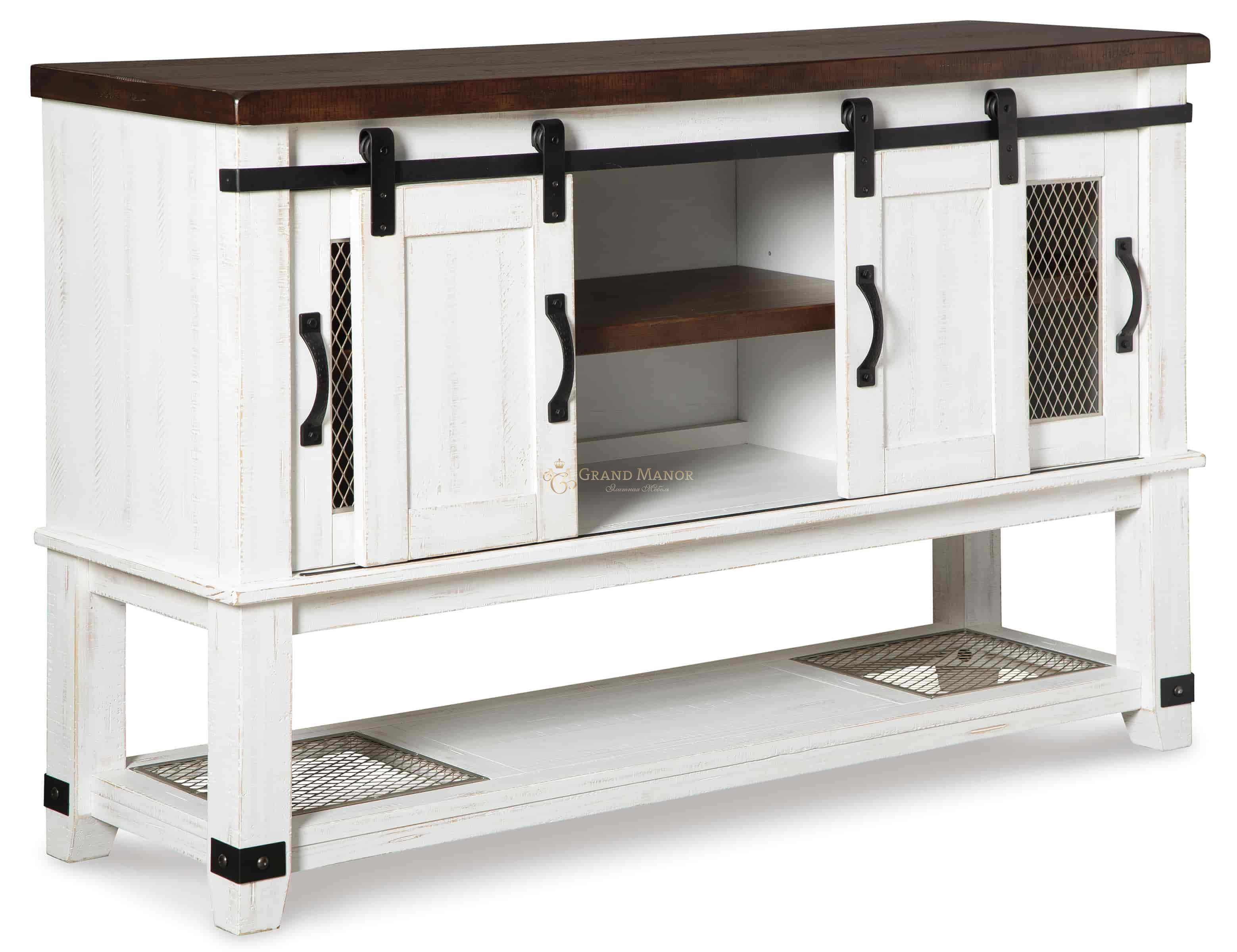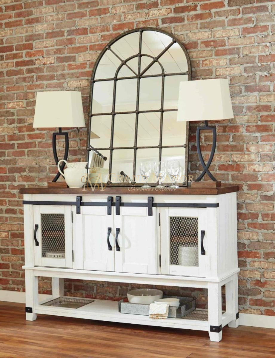 Особенность этого комода — дверцы шкафа с сетчатыми проволочными вставками, которые придают ему особый шарм. А раздвижные «амбарные двери» добавляют ещё больше пространства для хранения.
