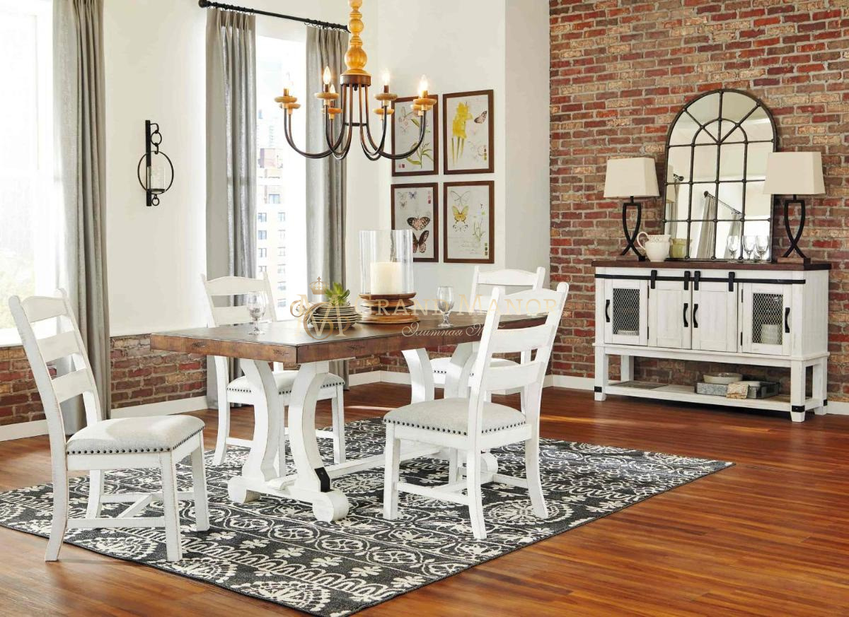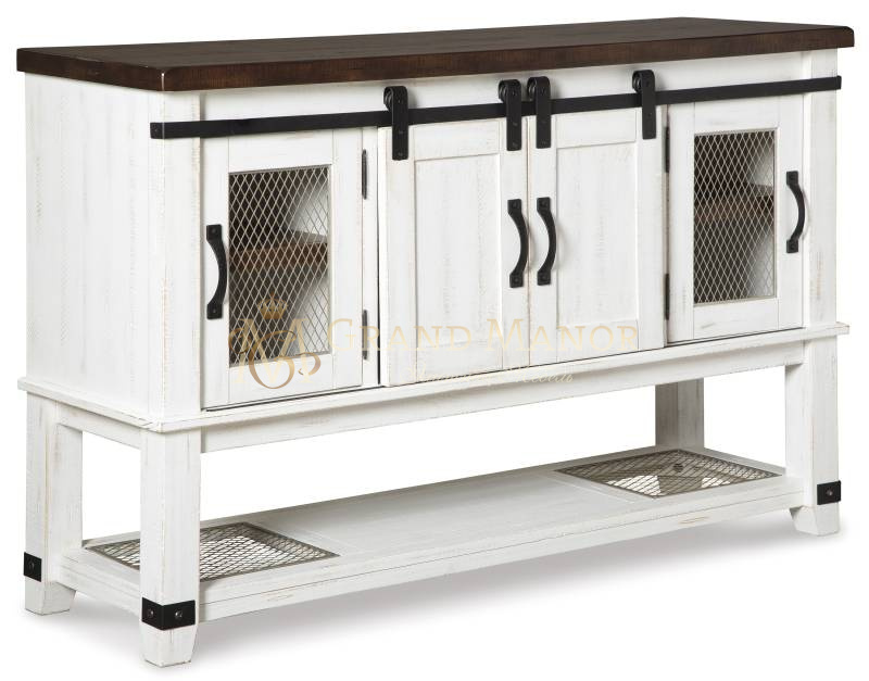 Эстетика сервировочного комода привлекает внимание своим двухцветным исполнением: потертый винтажный белый цвет сочетается с состаренной столешницей из натурального цвета сосны. Это придаёт ему особый шарм и делает его ещё более привлекательным.