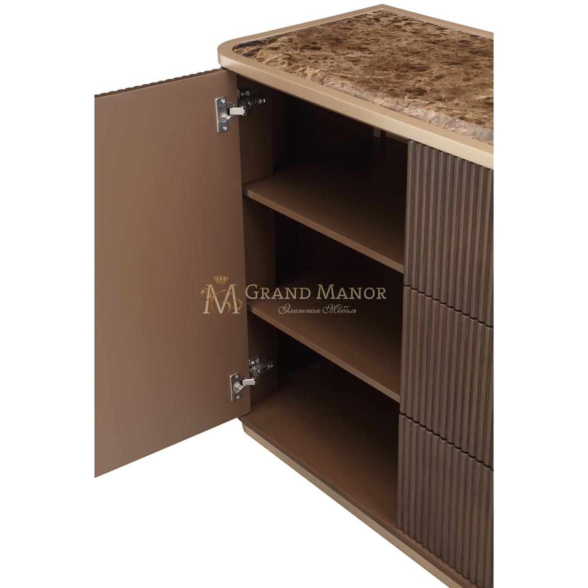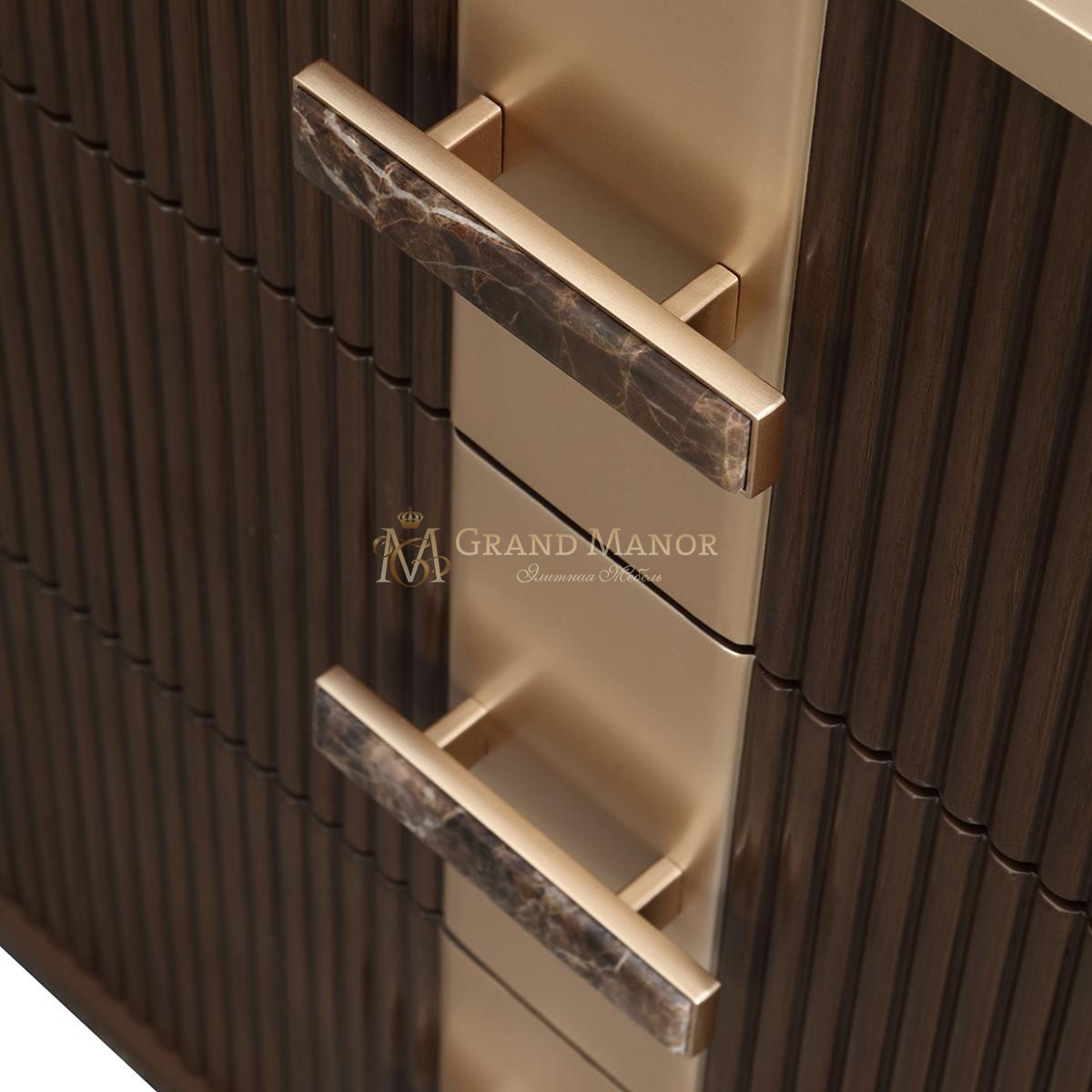 Три выдвижных ящика, отделанные золотистым металлом и мраморной фурнитурой, создают яркий контраст и обеспечивают удобство хранения.
