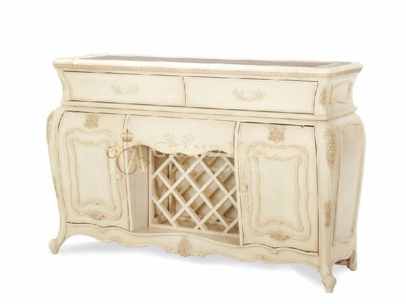 Предметы мебели известной американской компании Michael Amini отличают исключительное качество, красивый дизайн. Для их изготовления используются только натуральные материалы. Для сервировочного комода был выбран массив березы. Ее светлый оттенок и структура придают изделию привлекательный вид, а свойства древесины обеспечивают максимальные сроки службы.