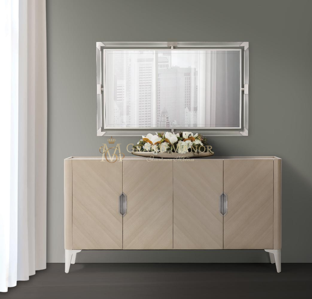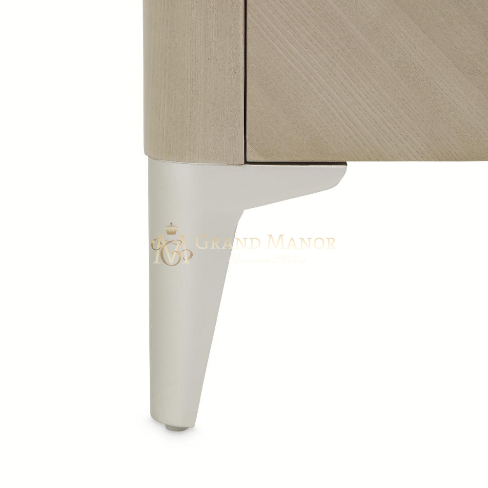 Дизайн выполнен из древесины тополя, окрашенного шпона вяза в пепельно-серый цвет с серебристыми вставками.