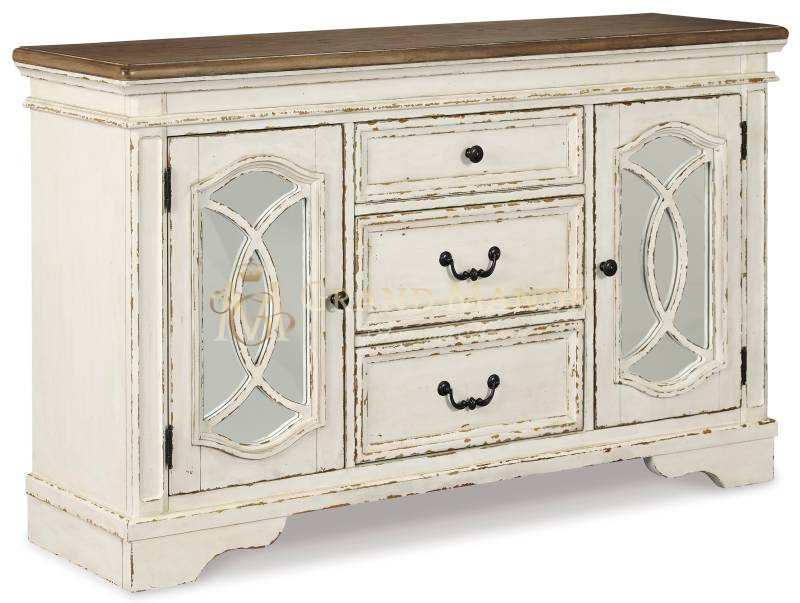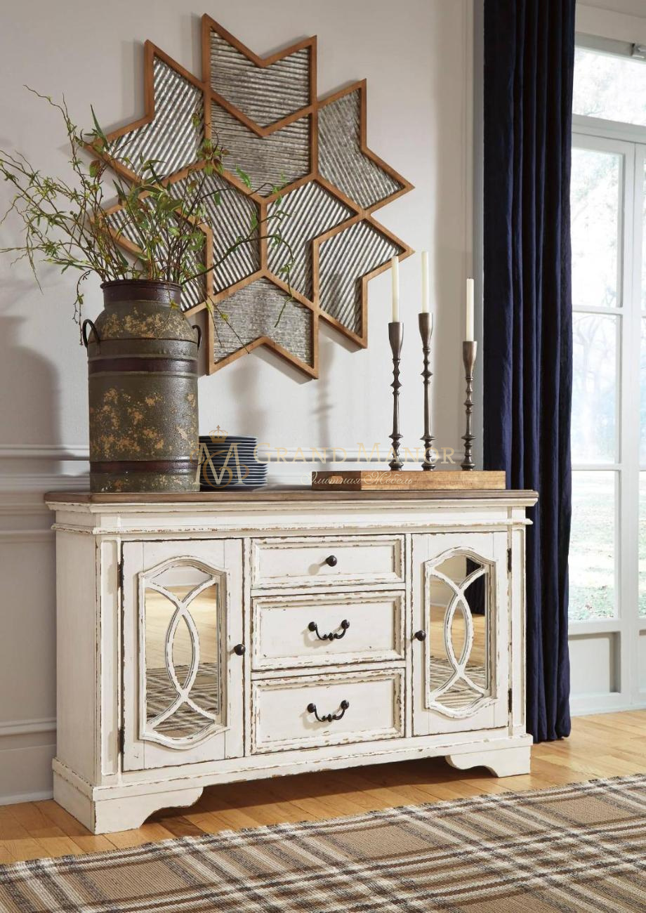 Уникальные элементы этого комода для хранения, украшенного декоративной лепниной на зеркальном стекле, и двойное очарование двухцветной отделки из состаренного дерева.