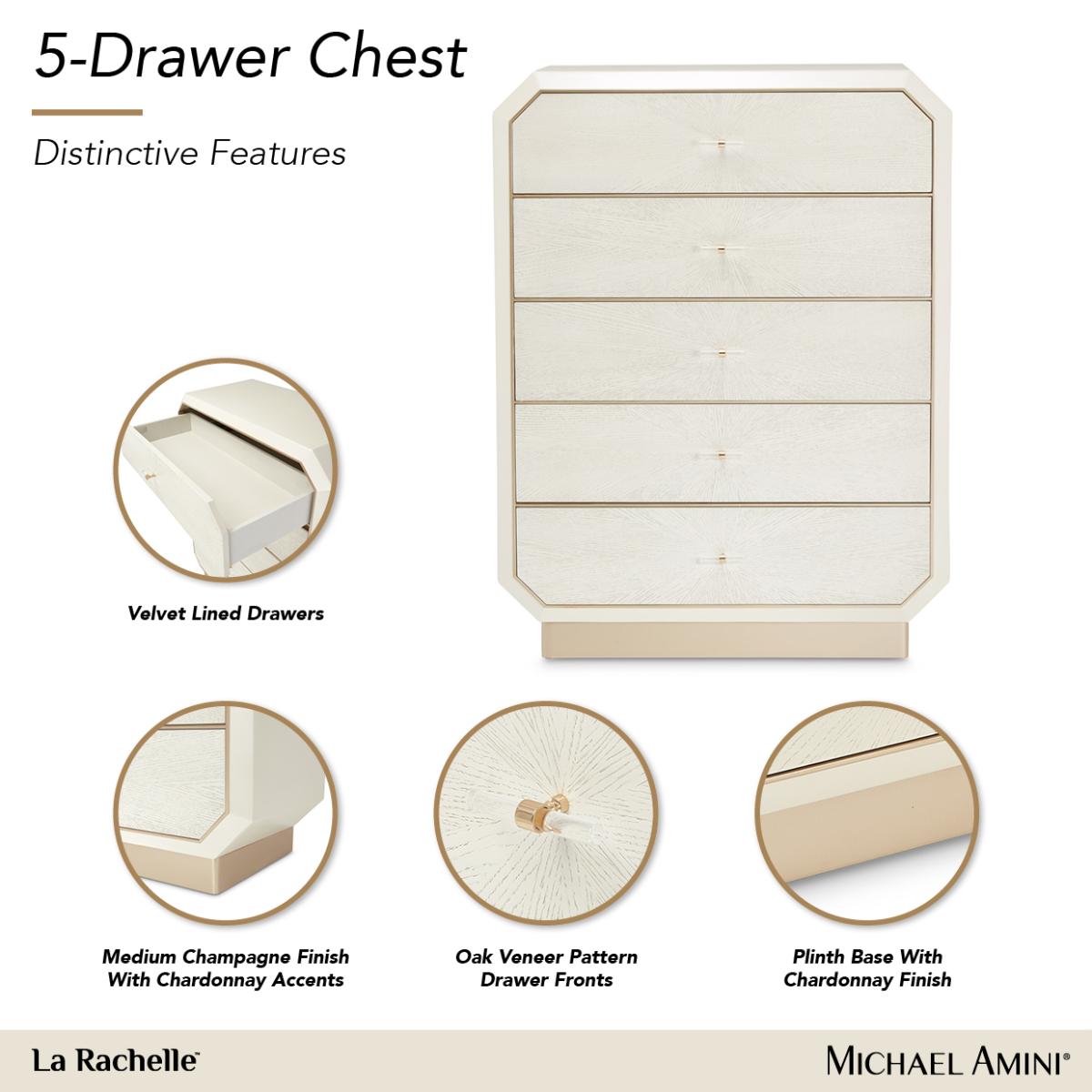 Комод La Rachelle - это больше, чем просто хранилище, с потрясающим рисунком из шпона starburst и фирменными обрезанными углами коллекции. Дополните его вашим любимым современным декором, и пусть ваш стиль сияет!