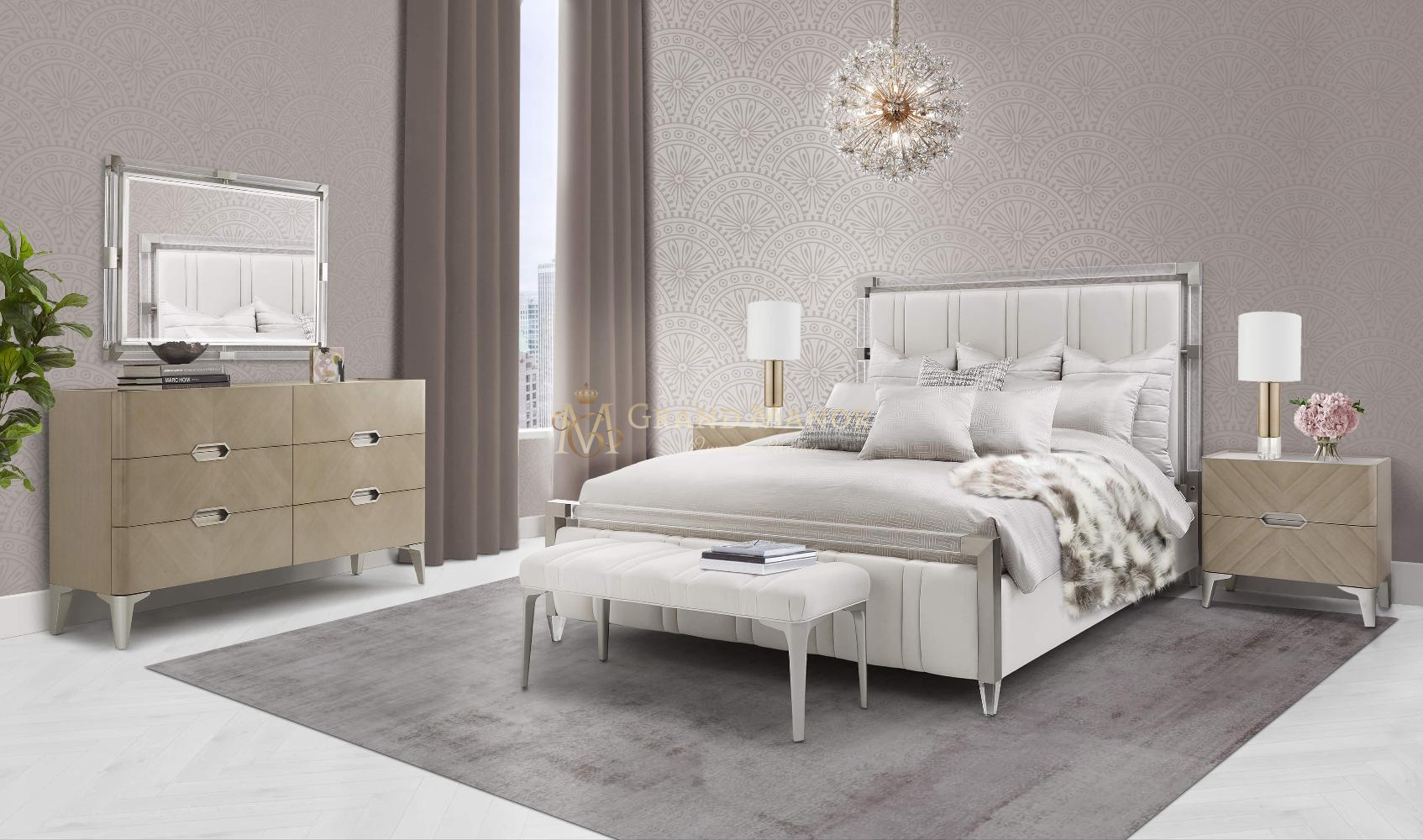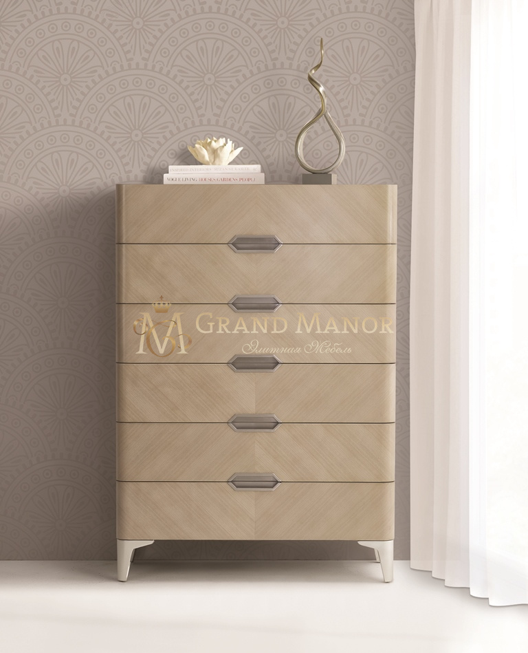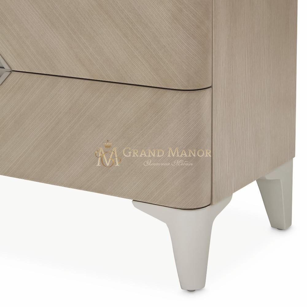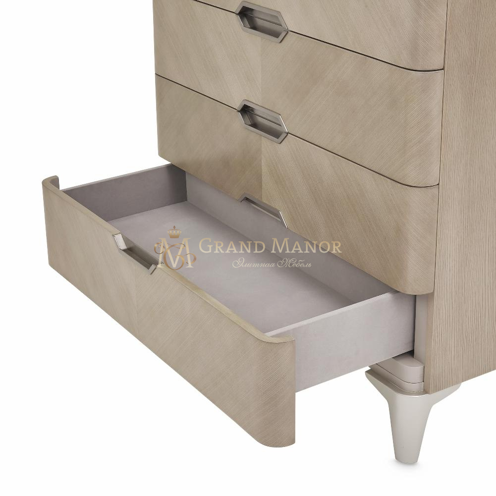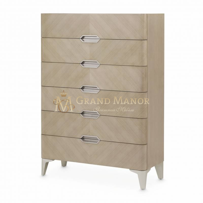 Наслаждайтесь безупречным хранением с комодом Penthouse Collection. Фурнитура из нержавеющей стали, ящики на бархатной подкладке и геометрический рисунок из шпона придают этому дизайну шикарный современный вид, который легко полюбить.